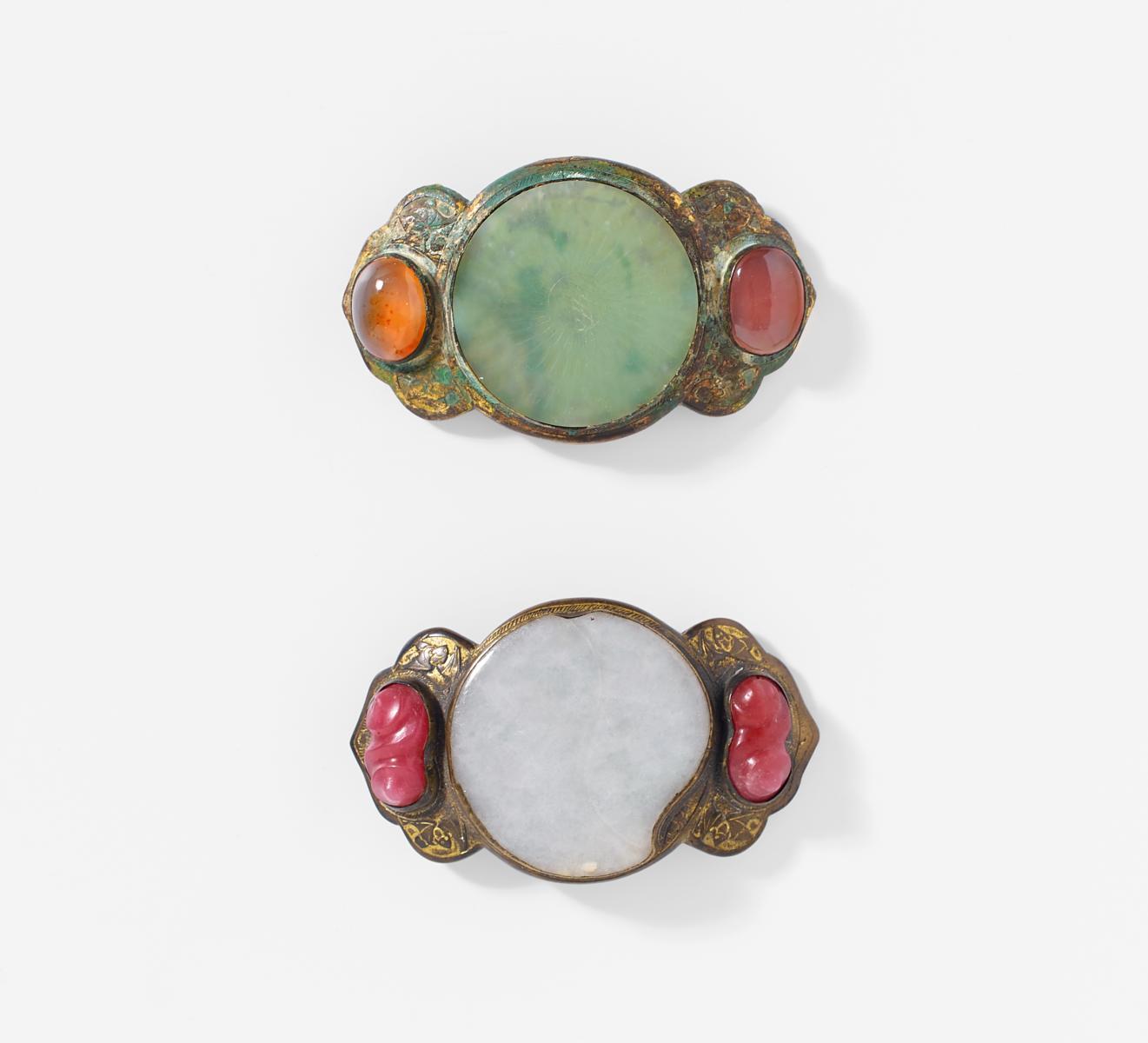 Technik: Jadeplatte in einer vergoldeten Bronzefassung mit jeweils zwei roten Schmucksteinen.