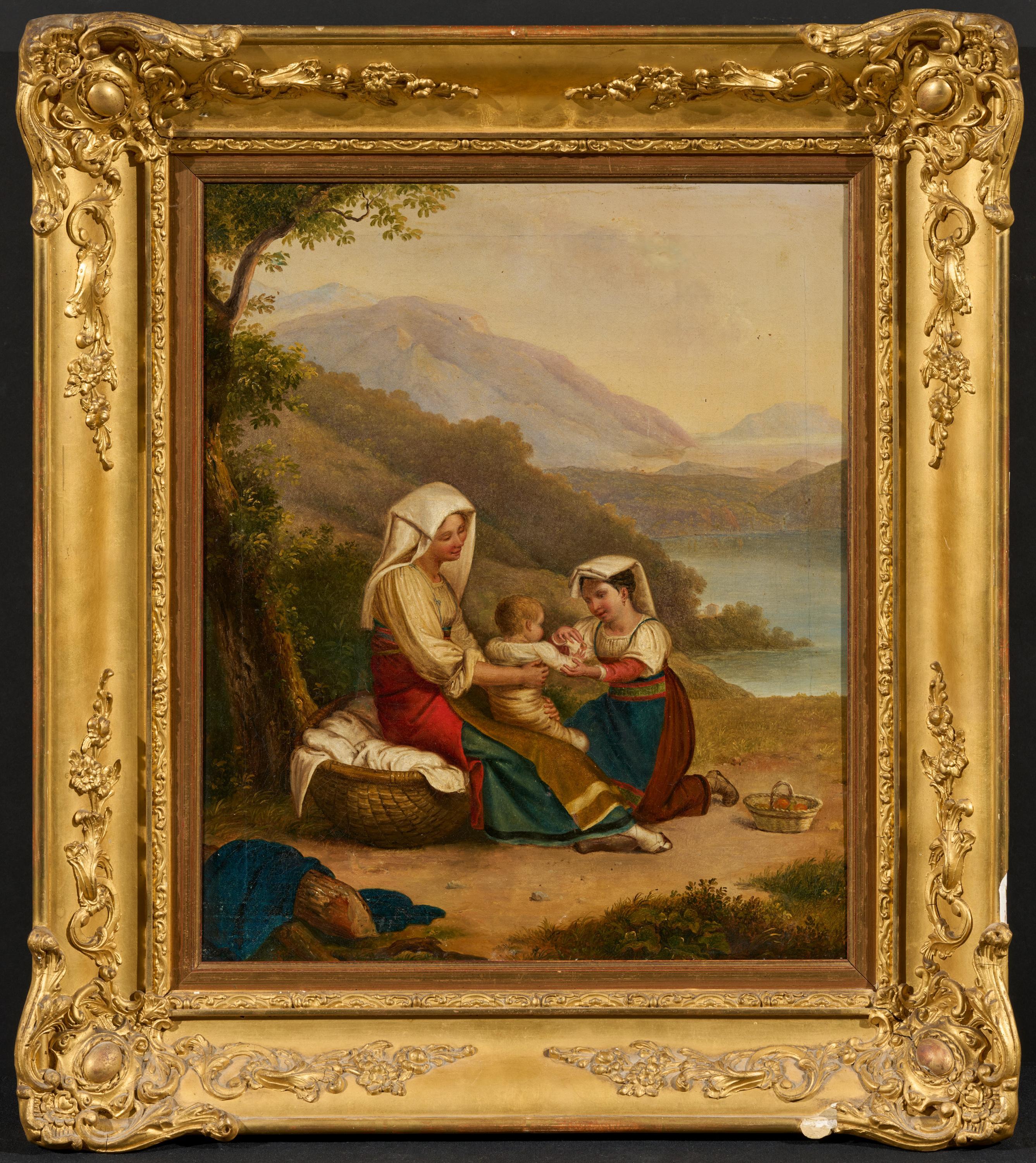 ZWEI ITALIENERINNEN MIT KIND VOR LANDSCHAFT