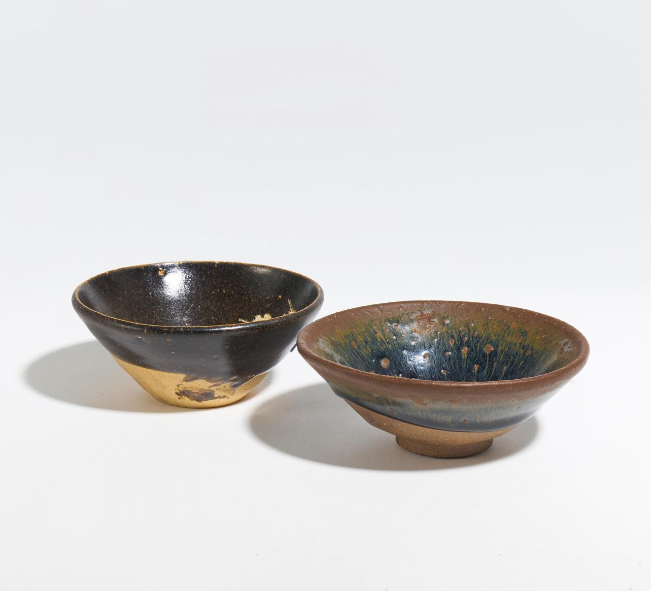 Beschreibung: a) Jian-Steinzeug mit Hasenfellglasur. H.4,3cm, Ø 11,8cm. b) Jizhou-Steinzeug mit