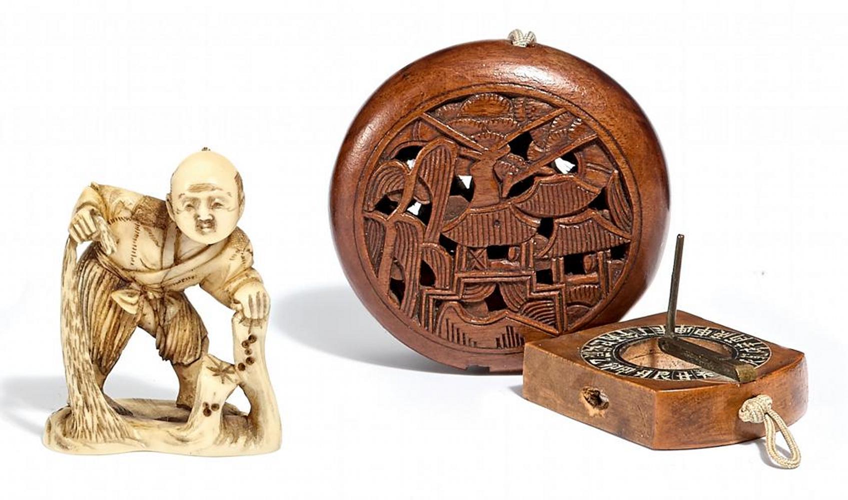 ZWEI MANJÛ UND EIN NETSUKE. LANDSCHAFT UND BLÄTTER, INNEN SONNENUHR. BUCHSBAUM.
