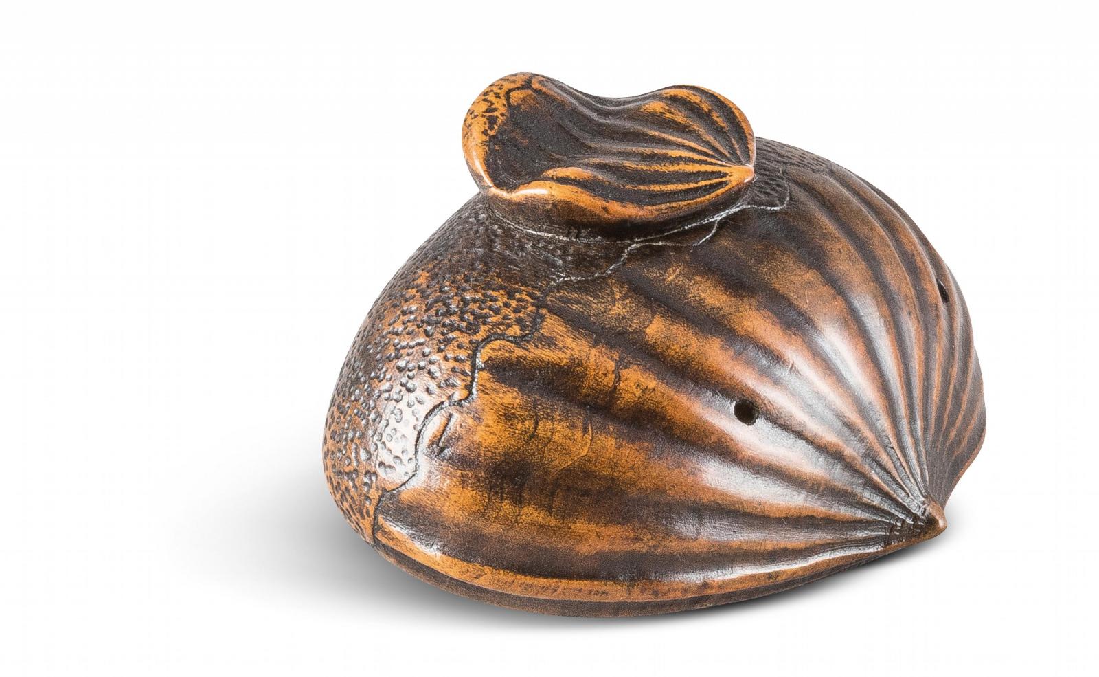 Beschreibung: A) Große Kastanie, auf der eine zweite kleine liegt. Buchsbaum dunkel eingefärbt. H.3,6cm,