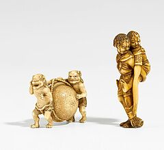 Beschreibung: A) Zwei Oni mit großem Kessel. Sign.: Tomomasa. B.4cm. B) Ashinaga und Tenaga. Sign.: