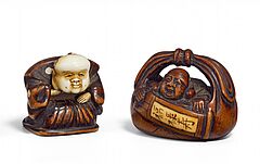Beschreibung: a) Kopf beweglich. Höhe 2,9cm. Sign.: Rakumin. b) Höhe 3cm. Sign.: Hôkei.