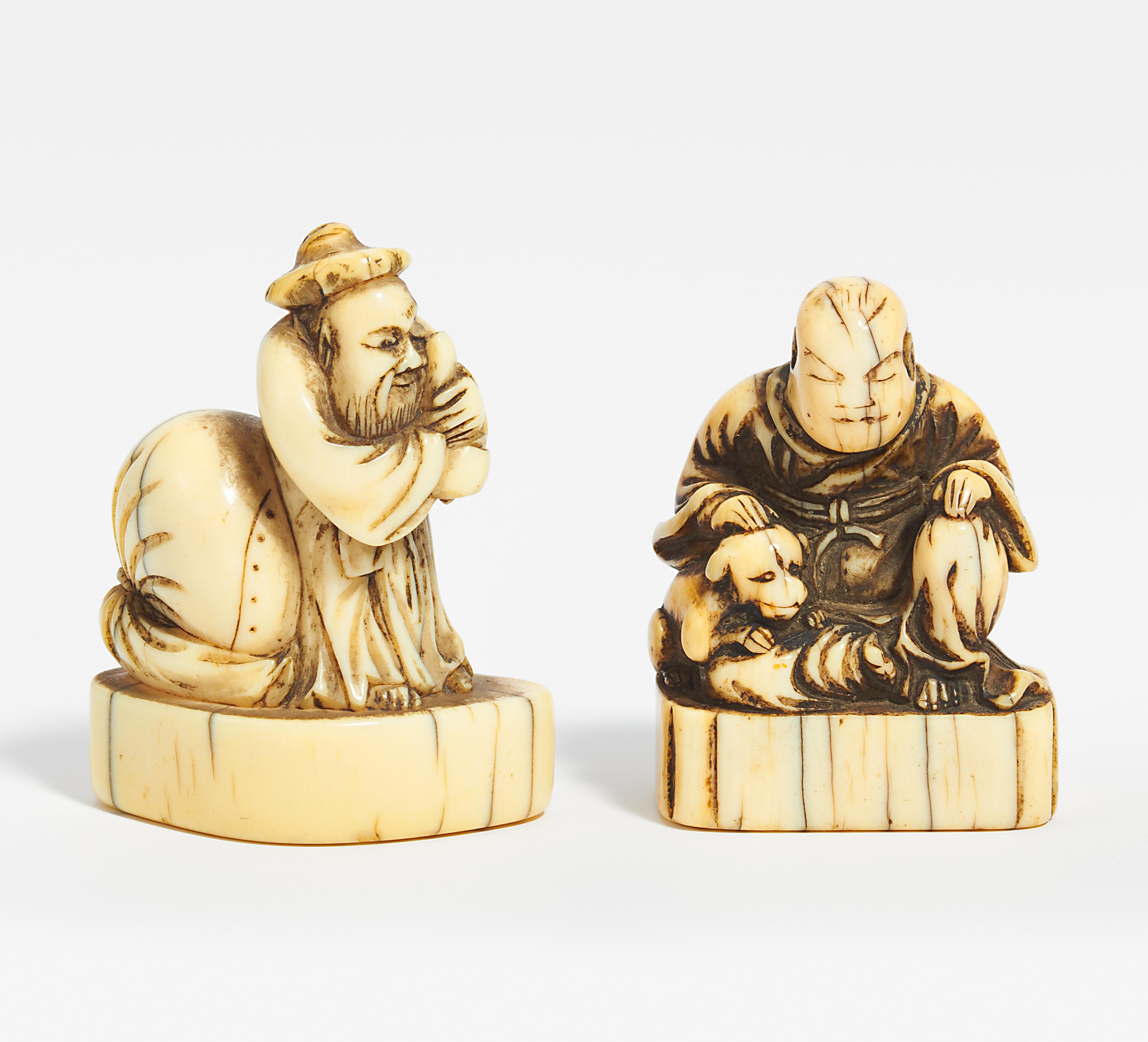 Beschreibung: a) Sitzender Chinese, seinen Hund streichelnd. Höhe 4,2cm. b) Chinese, ein Augenbad