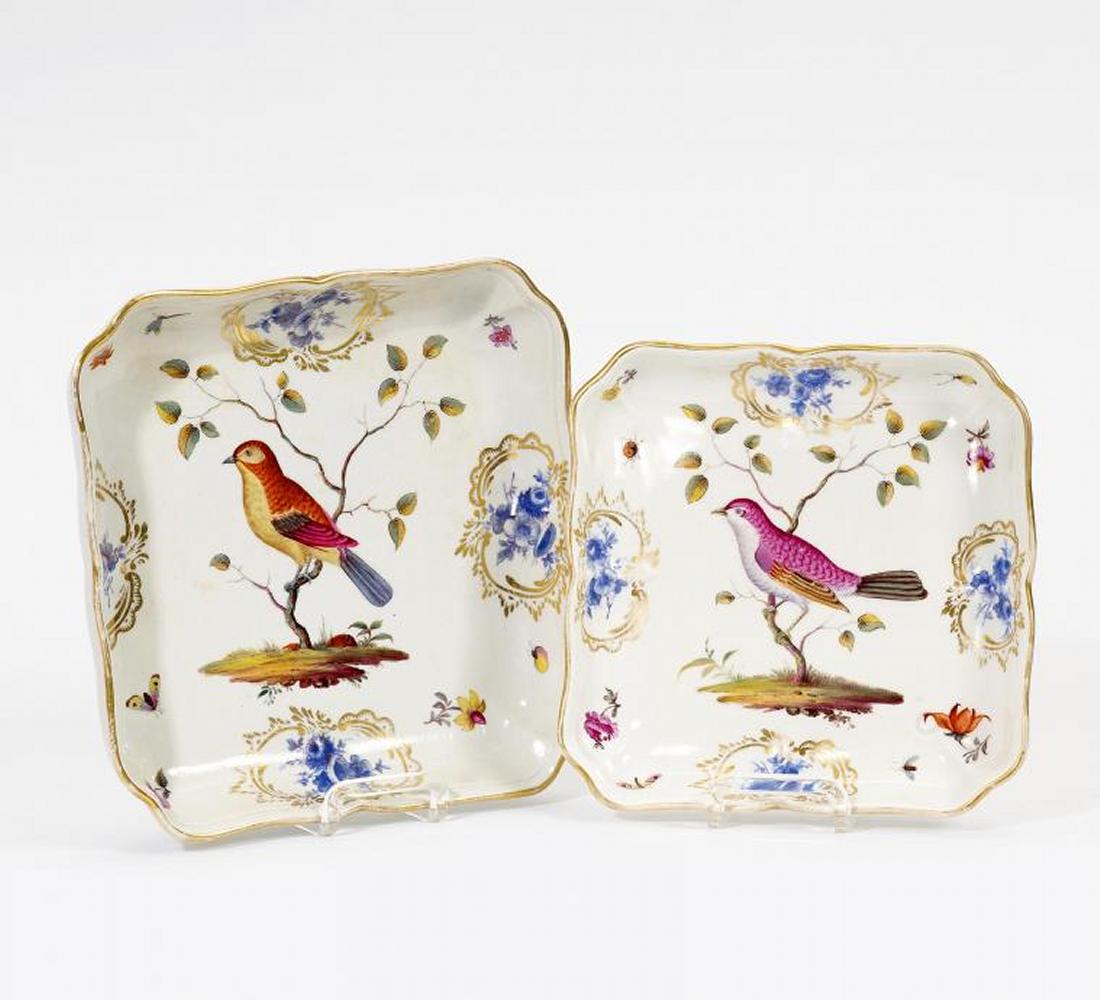 Porzellan, farbig und gold staffiert. 18,5 x 18,5cm/21,5 x 21,5 cm.