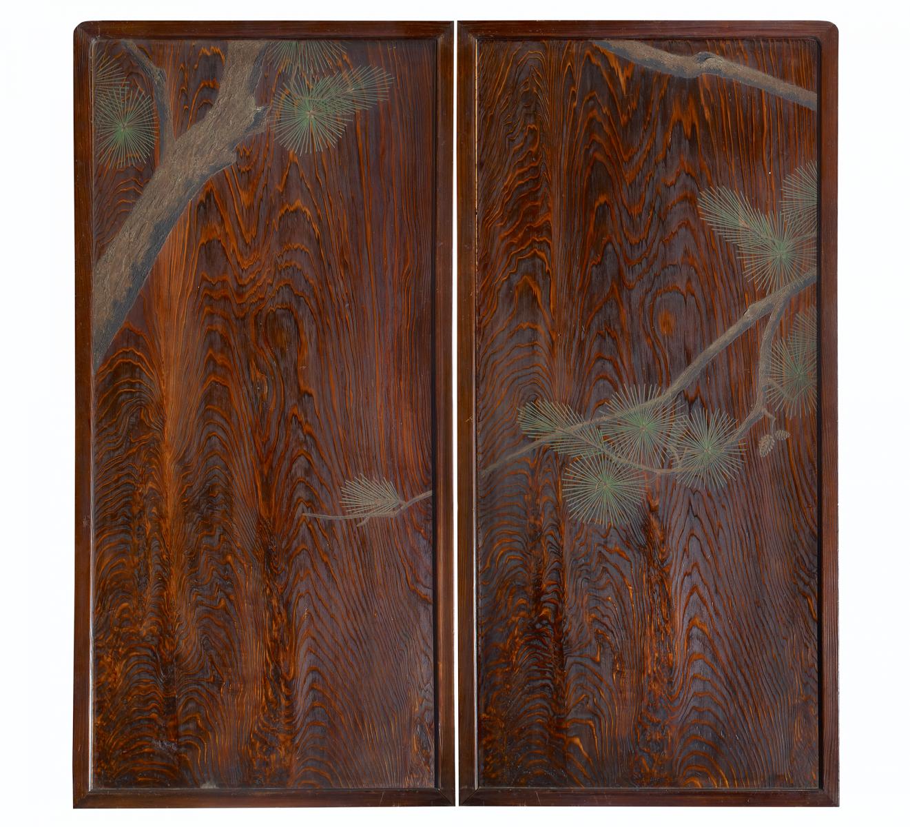 Beschreibung: Eine zusammenhängende Komposition von Kiefernzweigen und -stämmen, die sich über beide