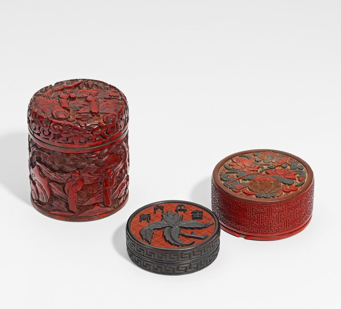 Zustand A/B. Beilage: Räucherwerkdose. Schnitzlack, schwarz auf rotem Fond. Wohl Japan. H. 2cm.