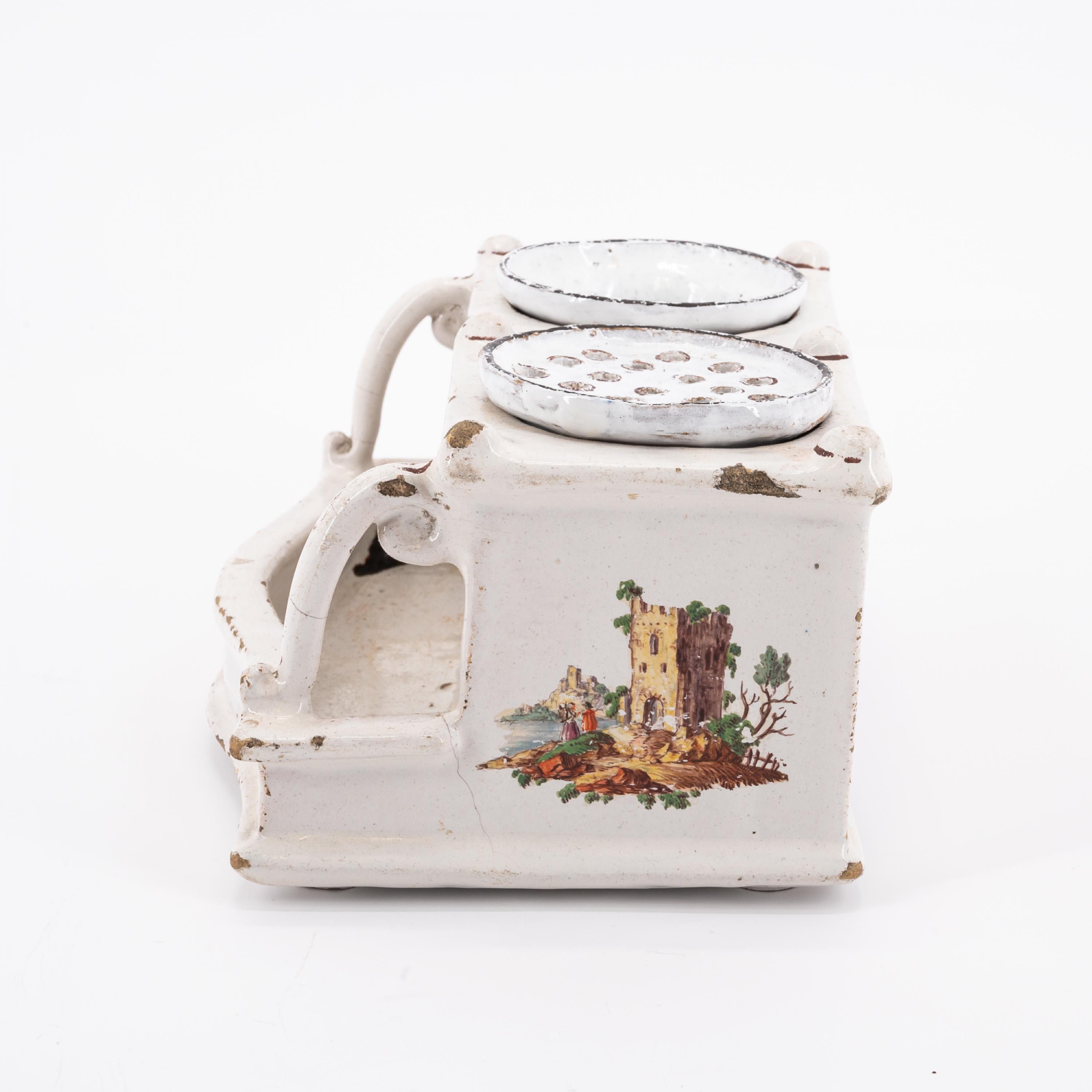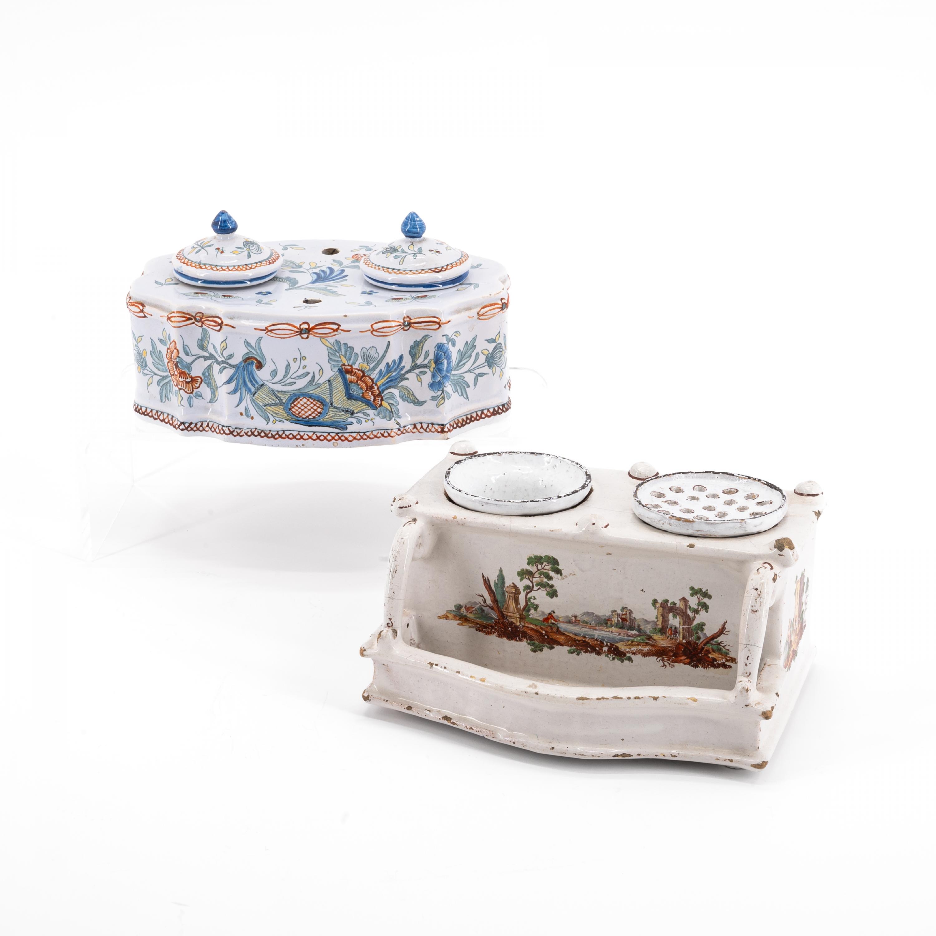 Technik: Fayence, lichtblaue bzw. leicht grau-weiße Glasur mit farbigen Dekoren .