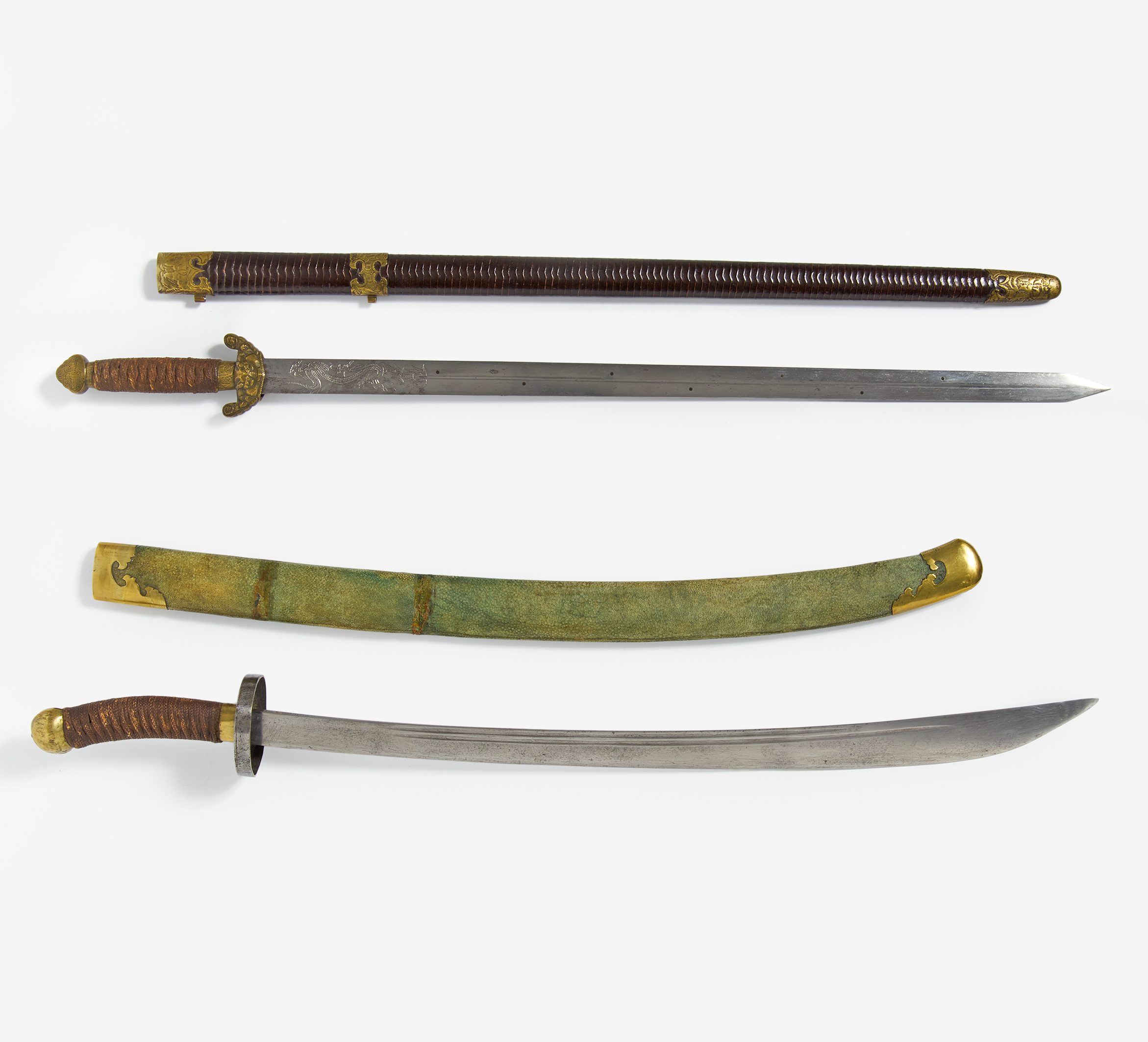 Beschreibung: a) Gerades Schwert (jian), vermutlich zweischneidig, mit Scheide aus Leder. Beschläge