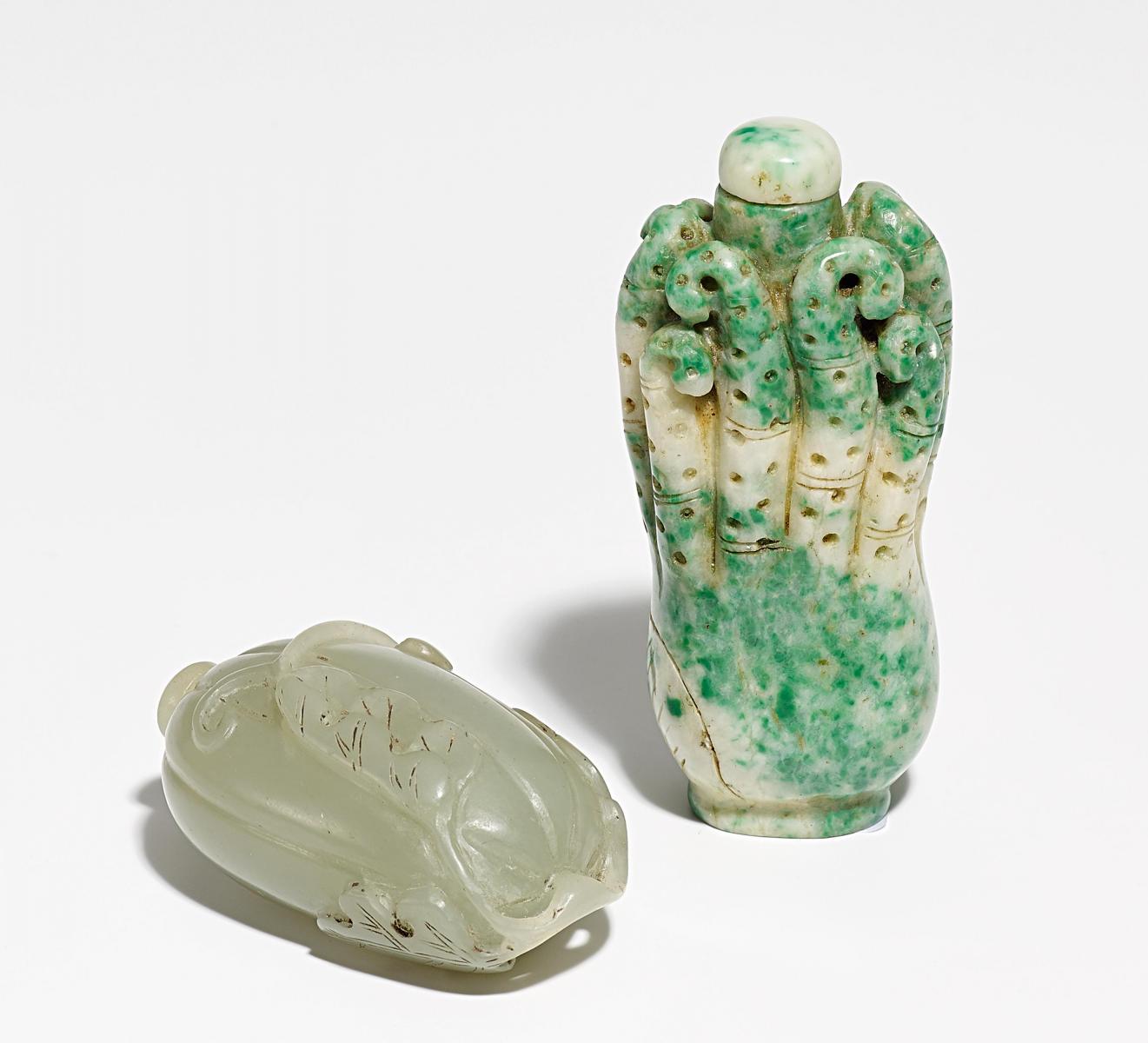 Technik: Grünlich-graue Jade bzw. grüne/weiße Burma-Jade. Flaschen in Form eines Kürbis bzw. einer Buddhashand-Zitrone.