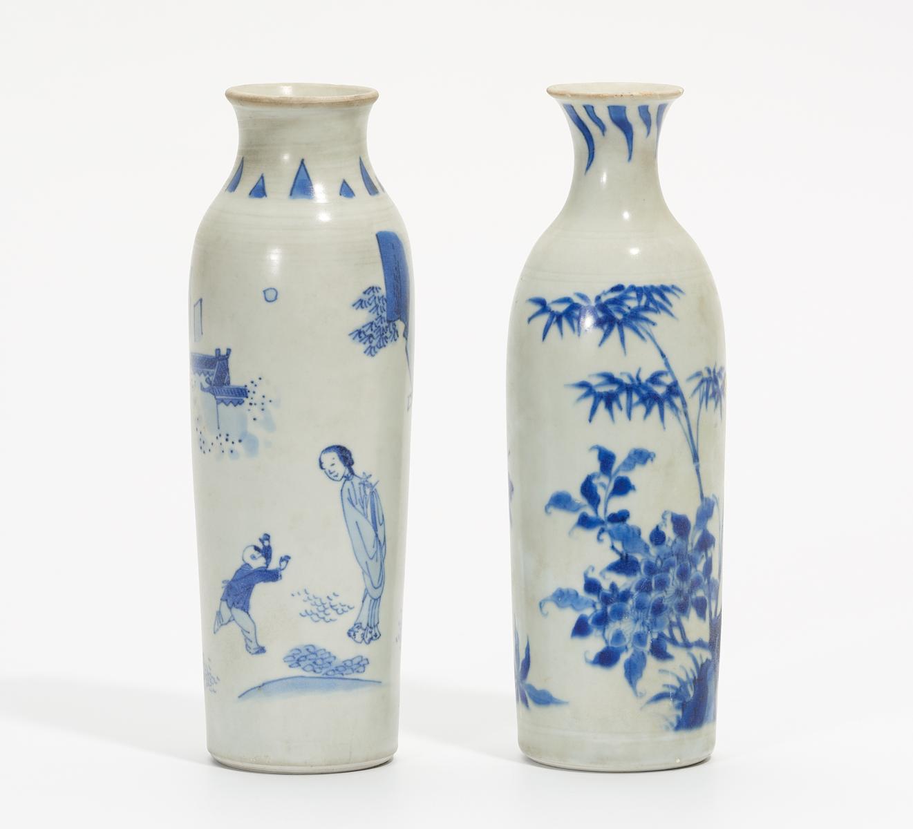 ZWEI VASEN MIT UNTERGLASURBLAUER MALEREI. PORZELLAN.