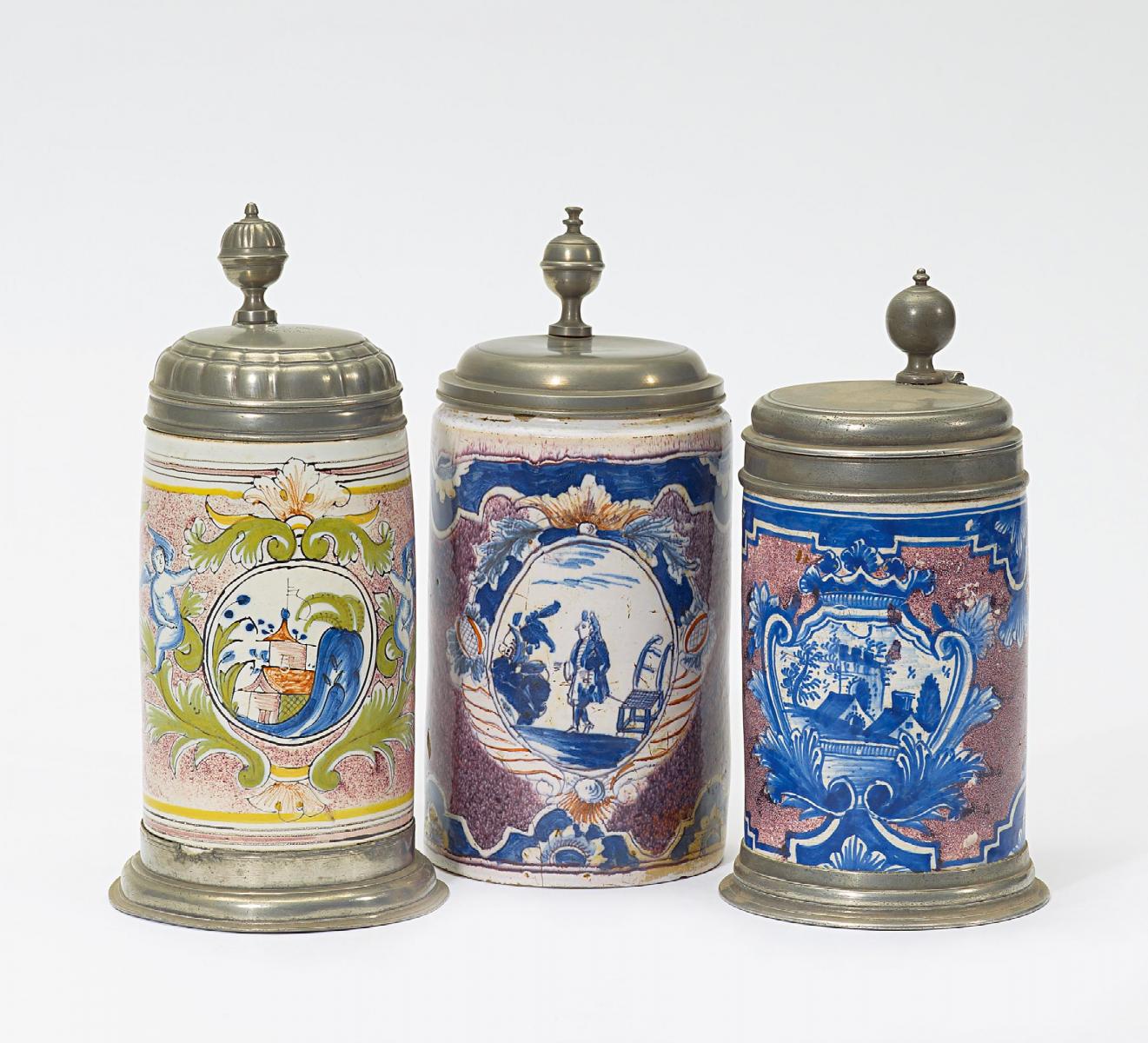 Deutschland. Technik: Sandfarbener Scherben, weiß glasiert, farbiges Dekor. Zinnmontierung.