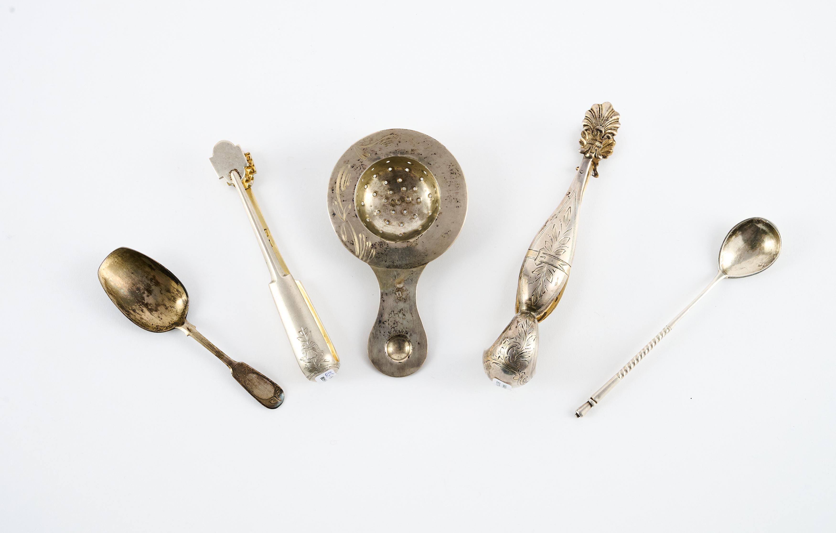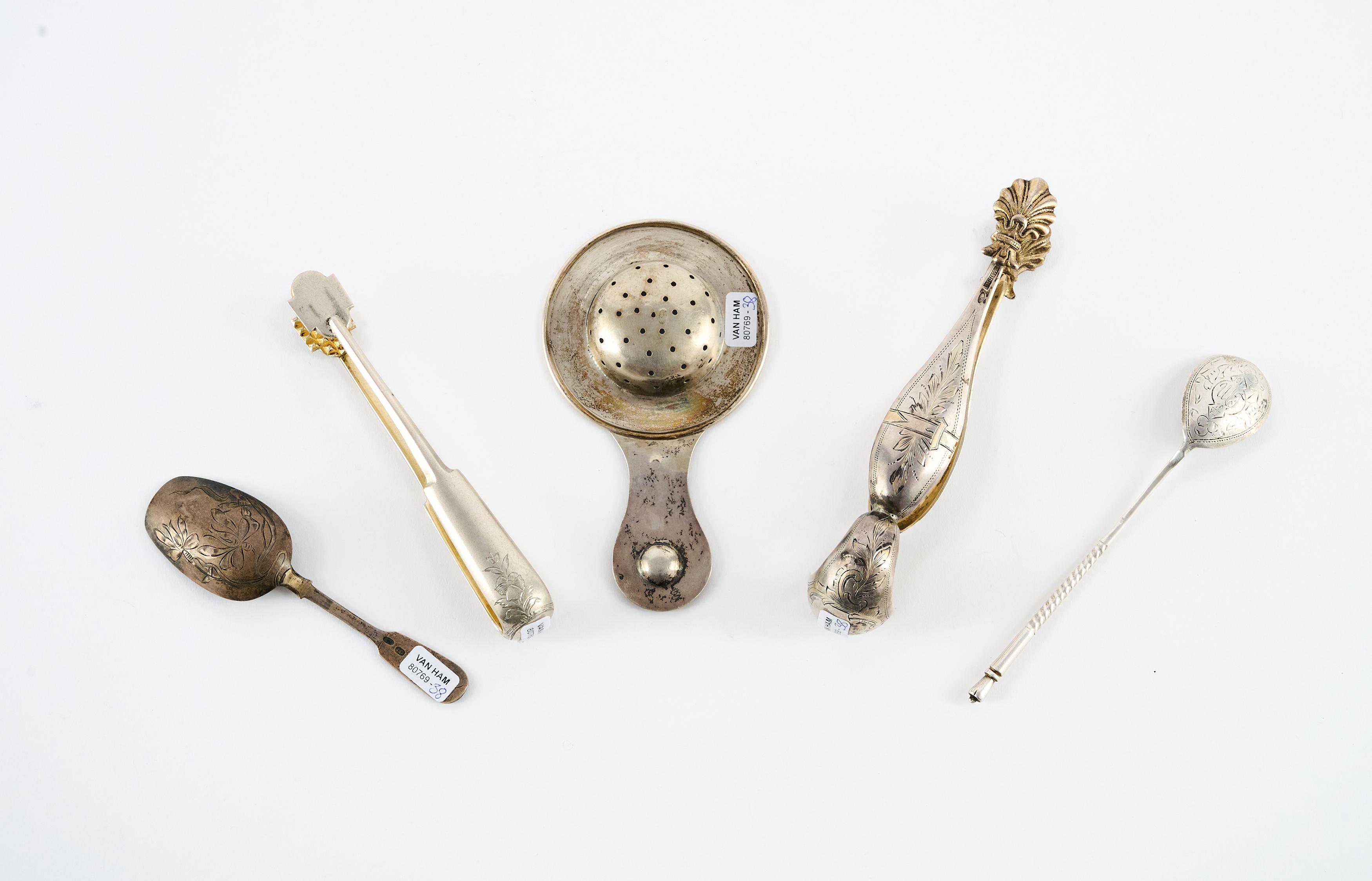 ZWEI ZUCKERZANGEN, TEESIEB, ZUCKERLÖFFEL UND TEELÖFFEL