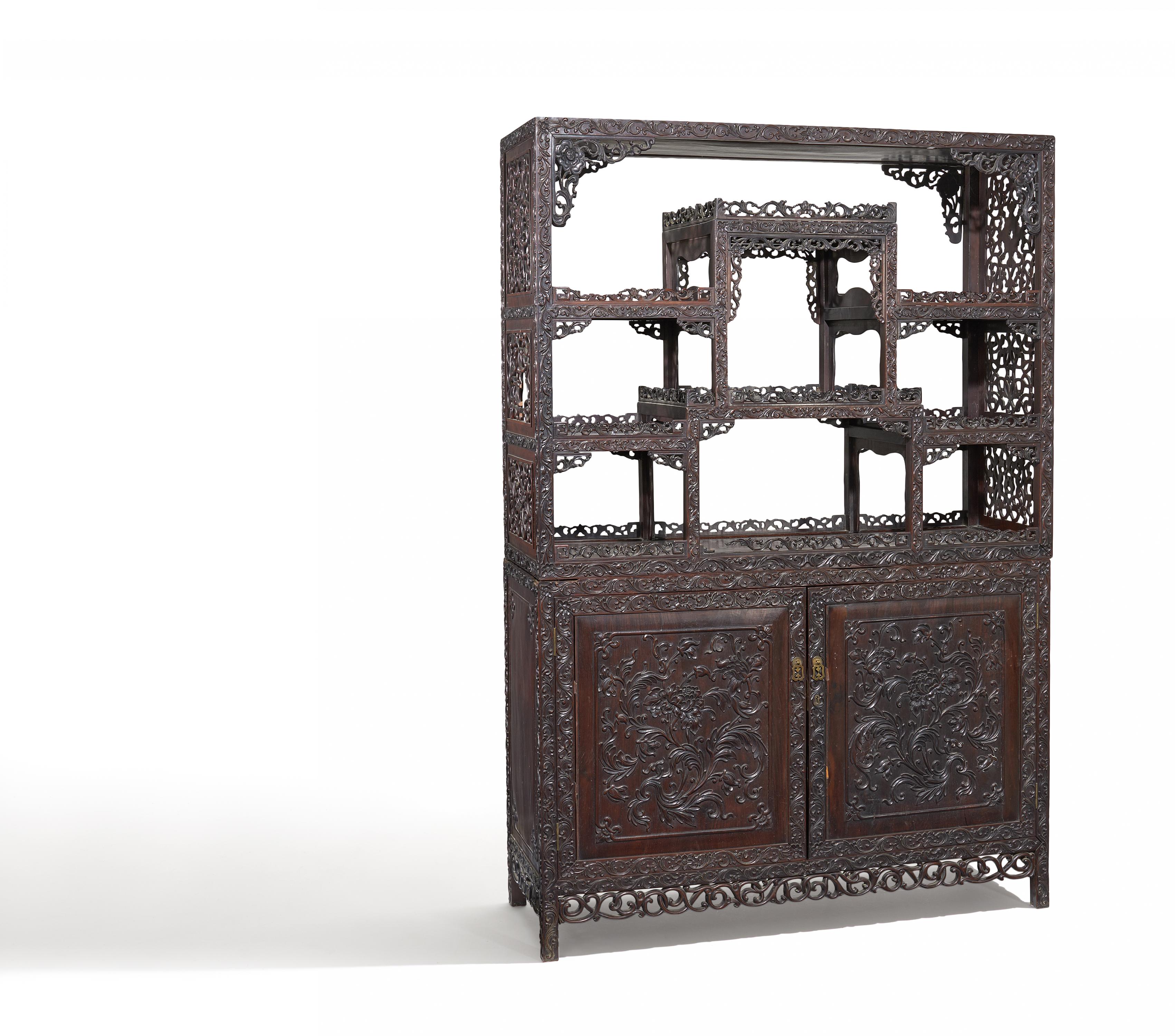 Technik: Dunkles Hartholz, teils durchbrochen und in Relief geschnitzt.