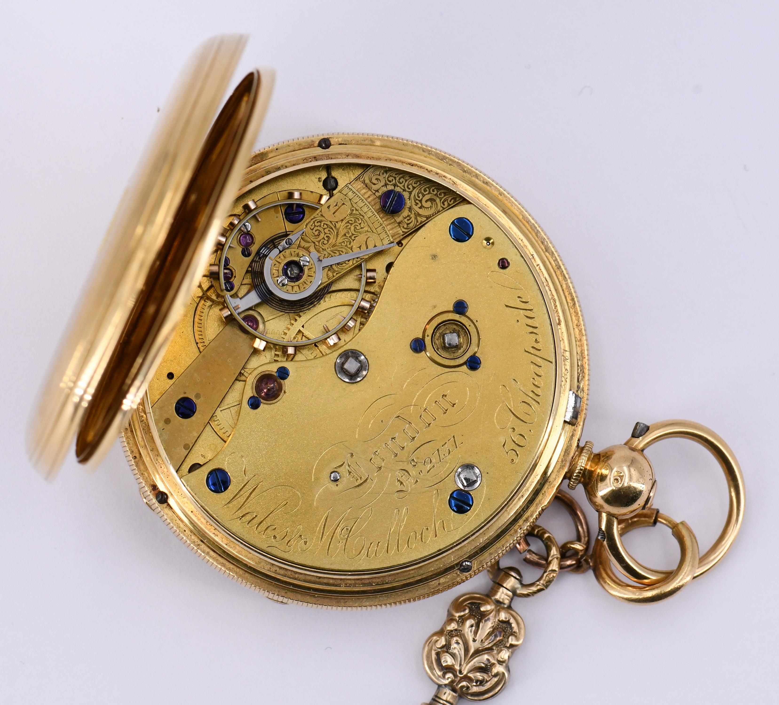 Beschreibung: Email-Zifferblatt mit Strichminuterie, Angabe von Datum, Wochentag, kleine Sekunde bei "6", Monatsangabe. Kunststoffglas schwach gewölbt, nicht original. Gehäuse mit Staubdeckel aus Massivgold, Münzrandprägung, runder Goldbügel mit Drücker zum Öffnen des rückwärtigen Deckels. Werk klassisches englisches ¾-Platinenwerk, graviert "WALES & McCULLOCH, 56 Cheapside, LONDON No 2131". Bimetallische Schraubenunruh/Kompensationsunruh, engl. Spitzzahnhemmung, Unruh unter Diamantrose, geschraubter Chaton.