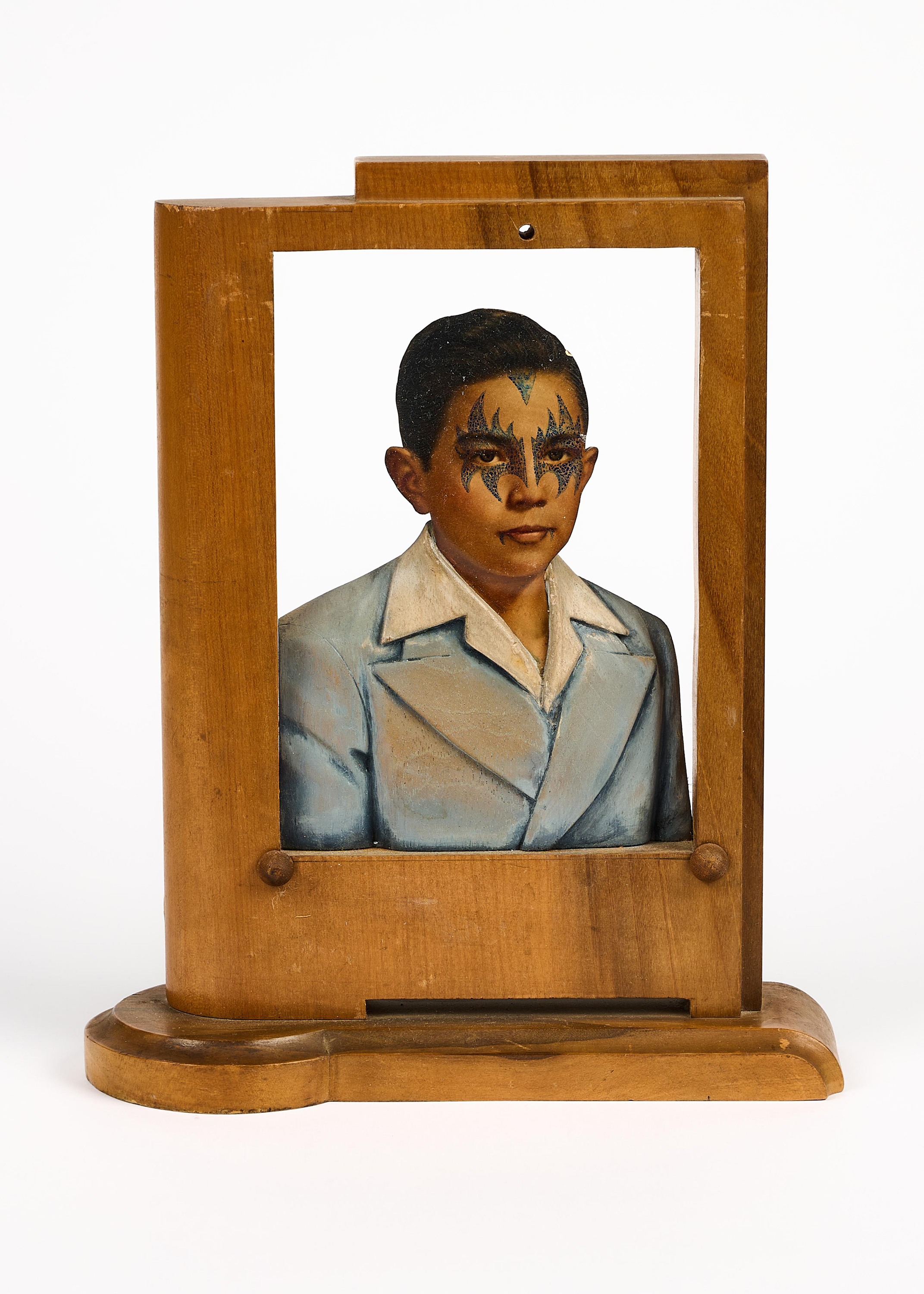 Technik: Tinte auf teilweise farbig gefasstem Reliefportrait aus Holz (objet trouvé).