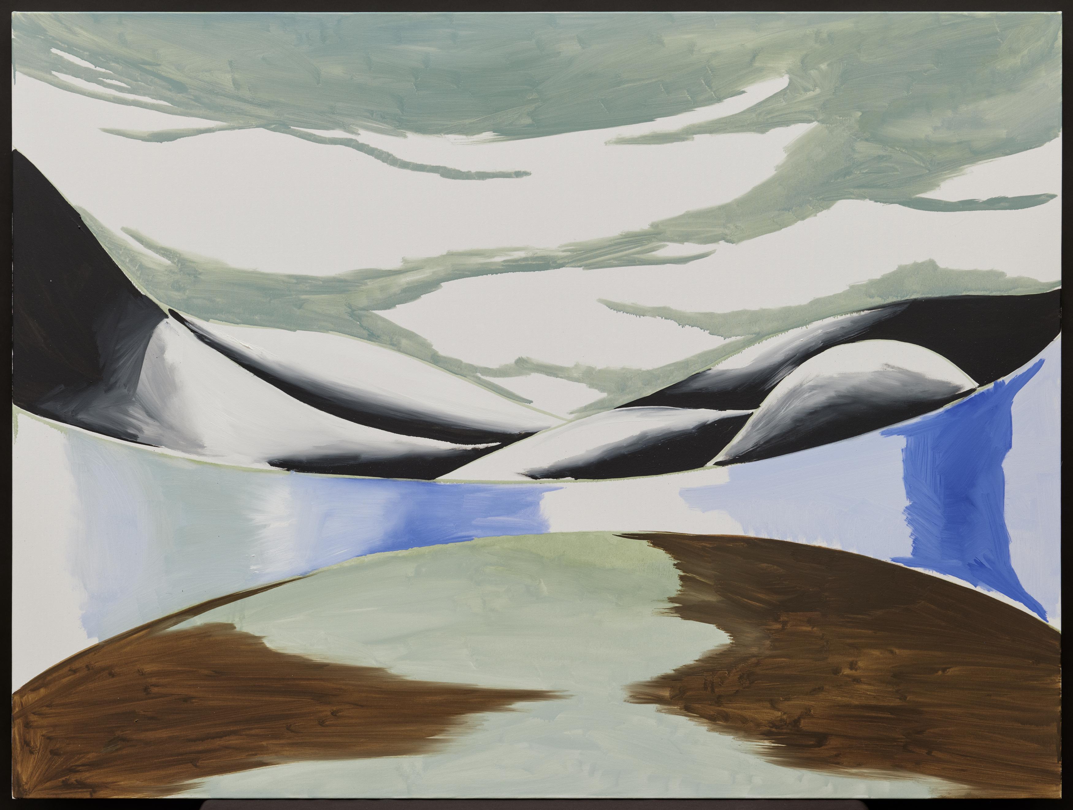 Die angebotene Arbeit zeigt eine Gebirgslandschaft, die aufgrund ihrer zurückhaltenden Farbigkeit karg und nordisch wirkt. Konvex und konkav geformte Linien bestimmen den Bildaufbau und erwecken den Eindruck, als würde man diese Landschaft durch zwei Linsen betrachten. Hier lotet Sasnal die Grenzen und Möglichkeiten der Darstellung aus und untersucht menschliche Seh- und Wahrnehmungsprozesse, die für sein Schaffen von zentraler Bedeutung sind.