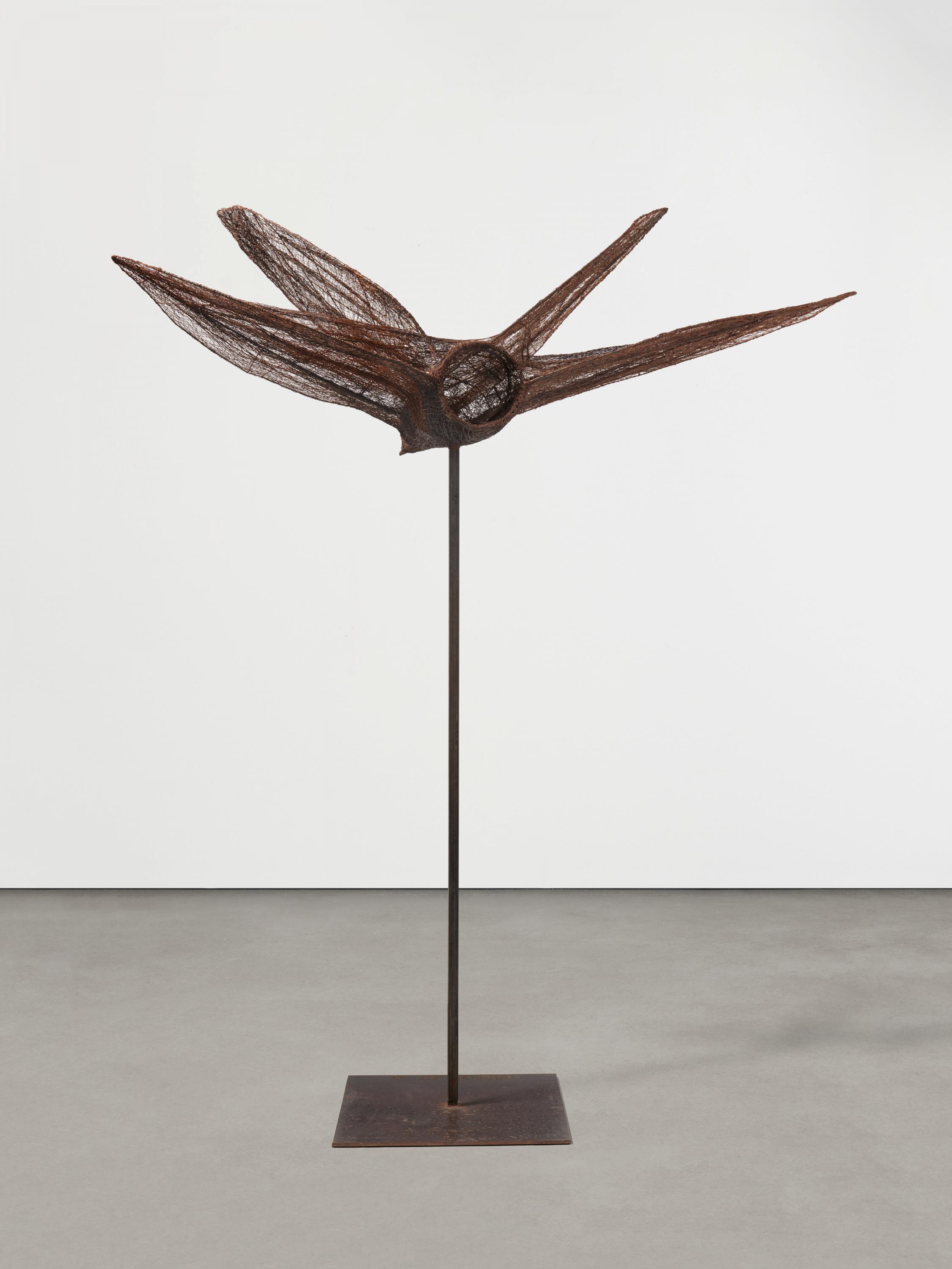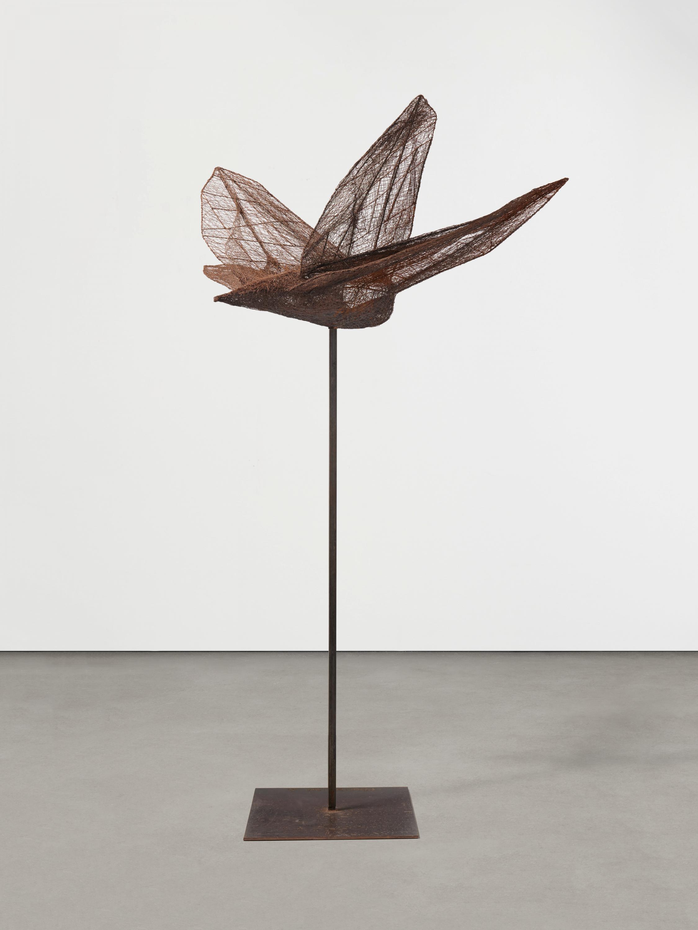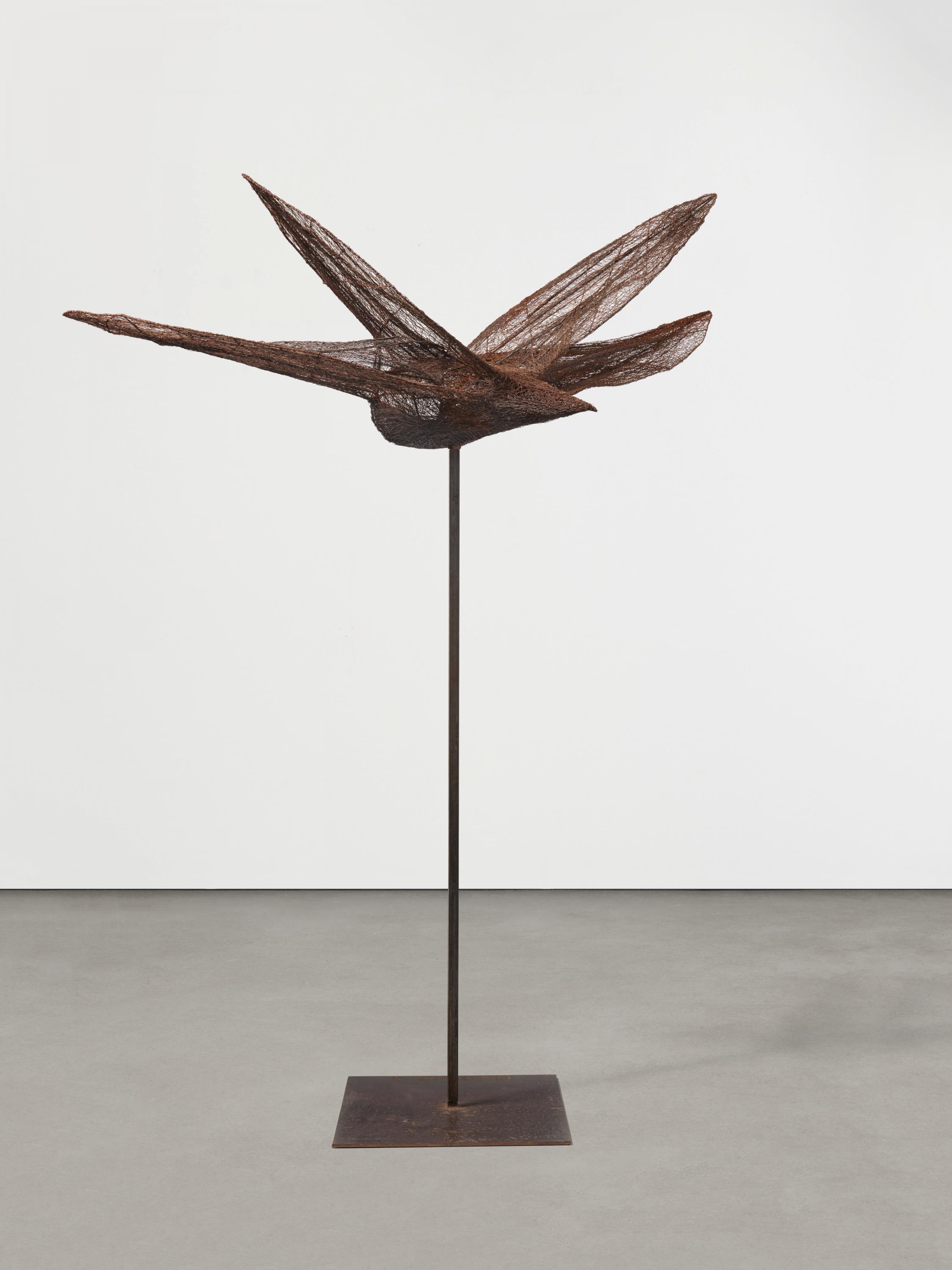 Das 1997 entstandene Werk "Ptak-Da" (Vogel) gehört in eine Phase ihres Schaffens, in der sie zunehmend Metall und andere harte Materialien verwendet. Eisen und Draht ersetzen zwar das Gewebe, doch die Struktur des Geflechts bleibt erhalten. Mit seinen Maßen von 275 x 210 x 120cm nimmt das Werk automatisch eine monumentale Präsenz im Raum ein. Der Vogel erhebt sich in den Raum, nicht als naturgetreue Darstellung, sondern als abstrakte Andeutung eines geflügelten Wesens. In dieser Übersteigerung schwingt auch eine Geste des Widerstands: Abakanowicz verwendet Größe, Maßstab und Material als Mittel des Protests gegen Begrenzung und Normierung.
