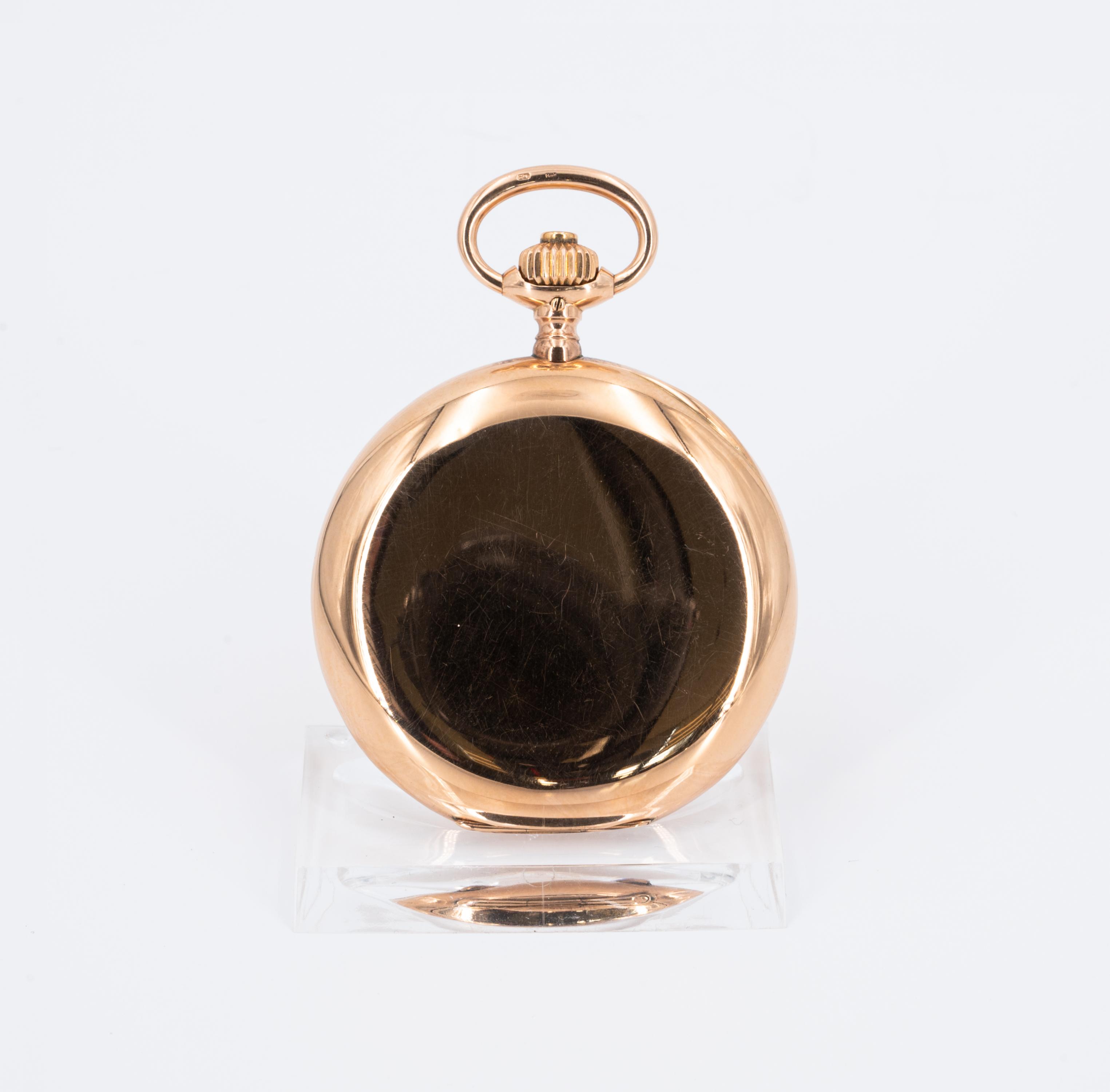 Gehäuse/Armband: 585/- Roségold, Innendeckel Metall vergoldet, Zffbl. Email, schwarze Indizes, Zeiger golden.