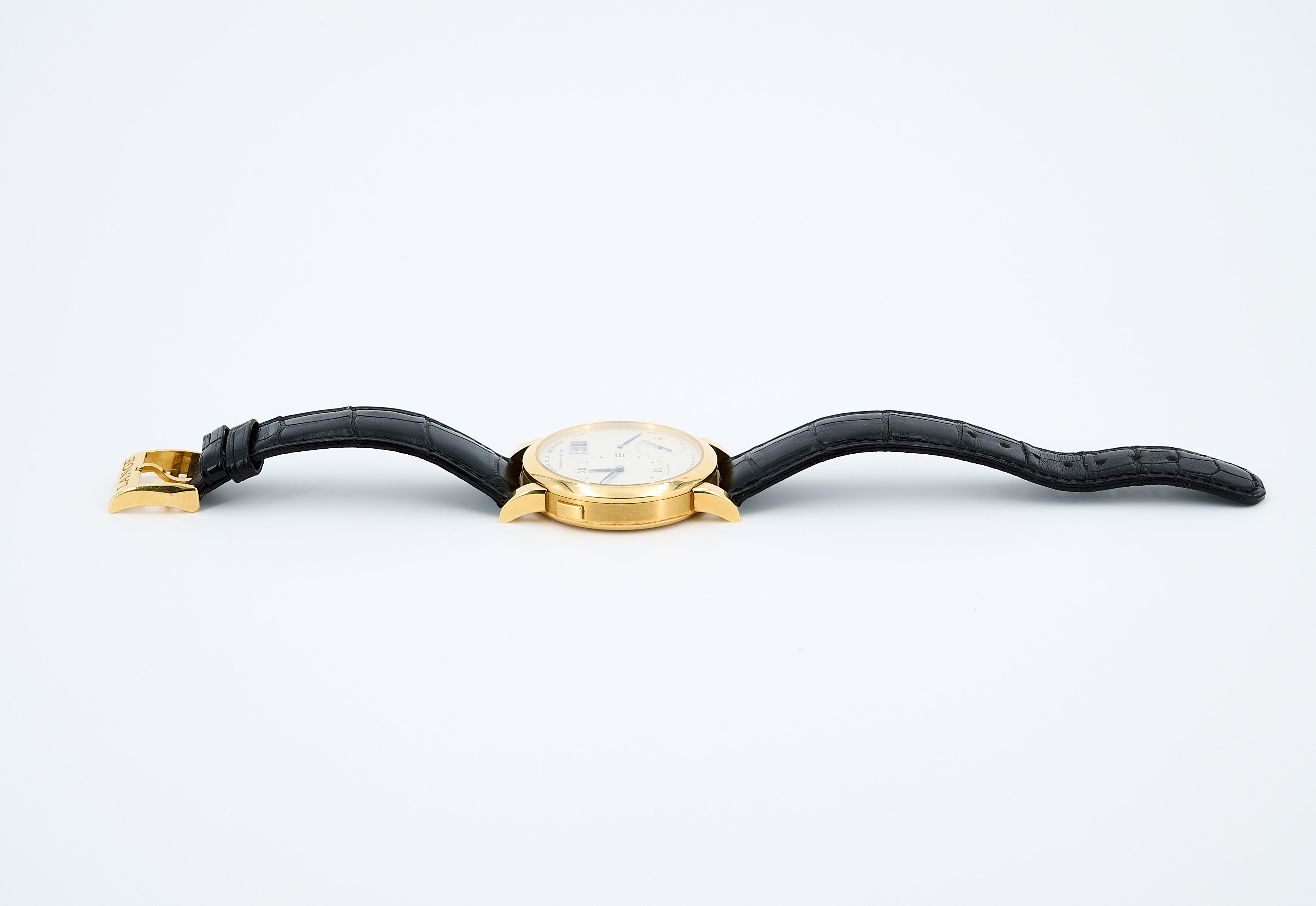Gehäuse/Armband: 750/- Gelbgold, Lederarmband mit Dornschließe, Zffbl. silbern, Zeiger gebläut, römische Ziffern schwarz.