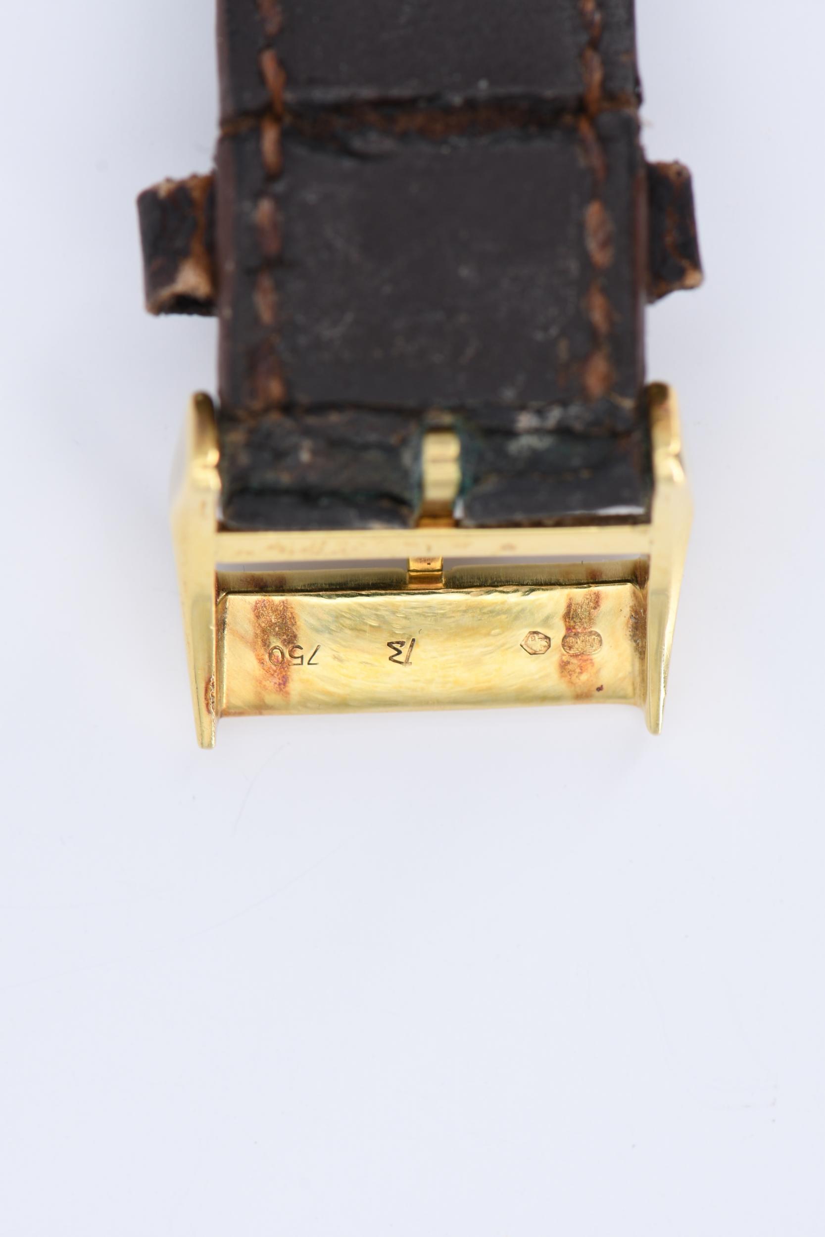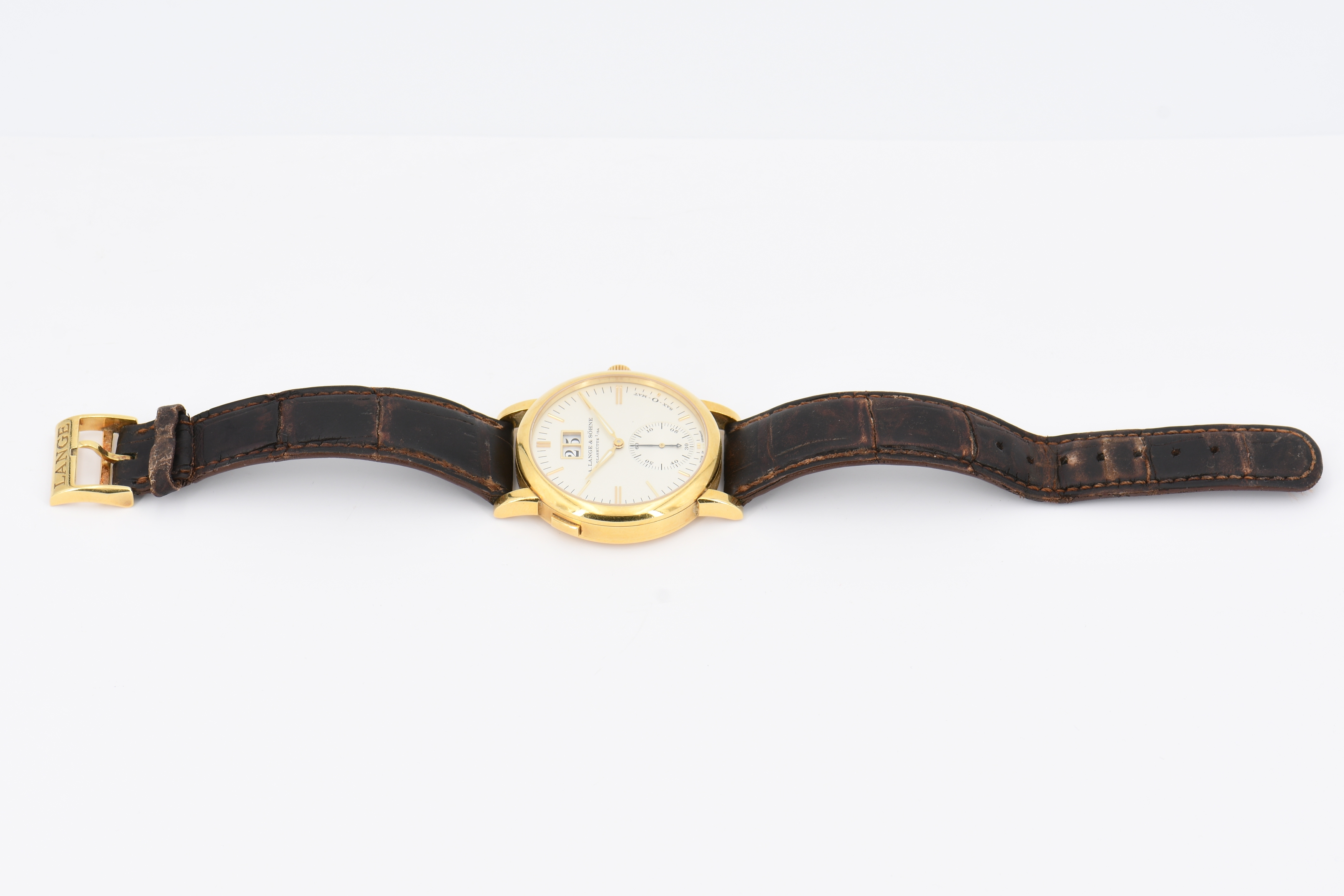 Gehäuse/Armband: 750/- Gelbgold, Glasboden, Lederarmband, Stiftschließe Gold, Metallziffbl. versilbert, Indizes gold, Großdatum.