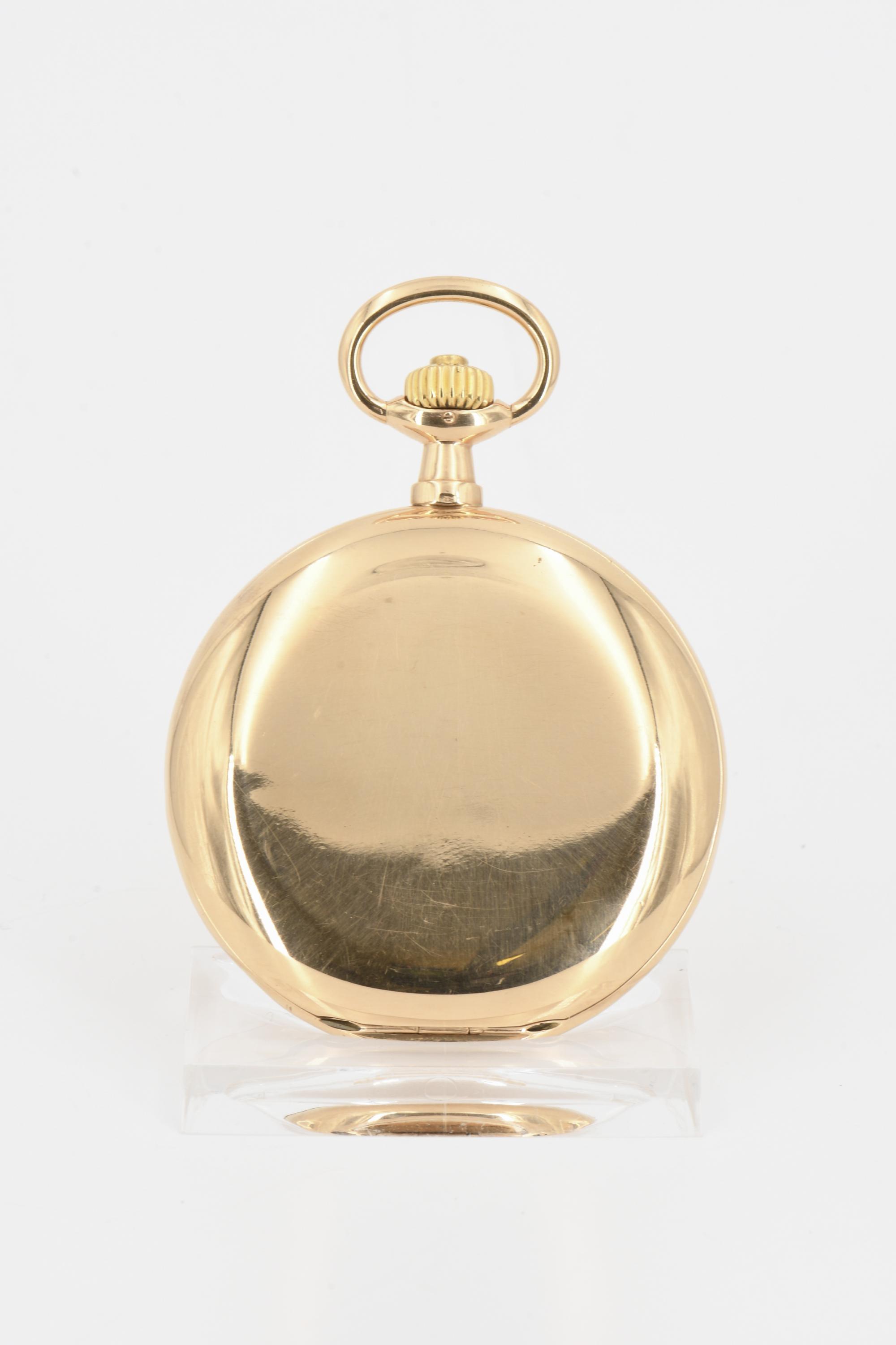 Beschreibung: Gelbgold Sprungdeckelgehäuse, Uhrwerk Qualität 1A mit Diamantdeckstein, Rückfederfeinregulierung, 3-teiliges Emailblatt.