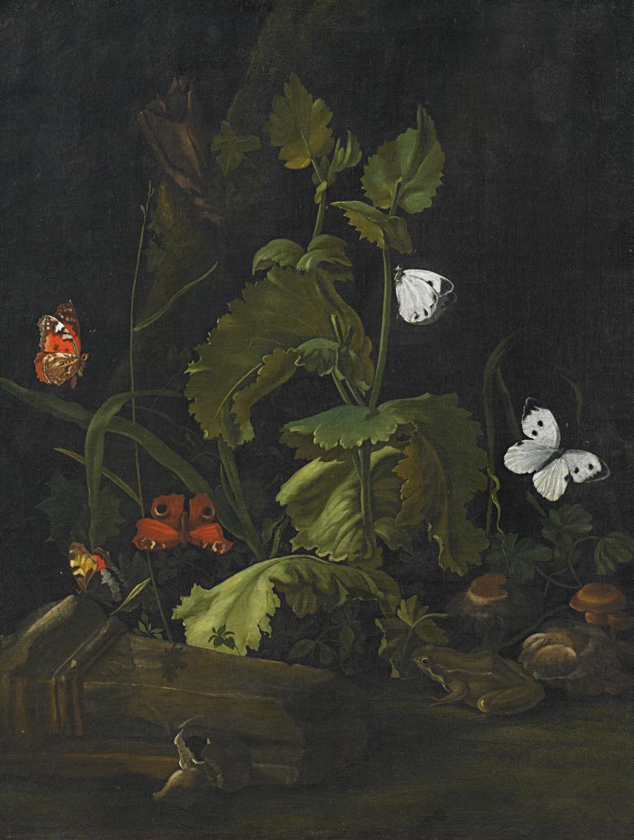 Titel: Stillleben mit Schmetterlingen und einem Frosch am Wegesrand.