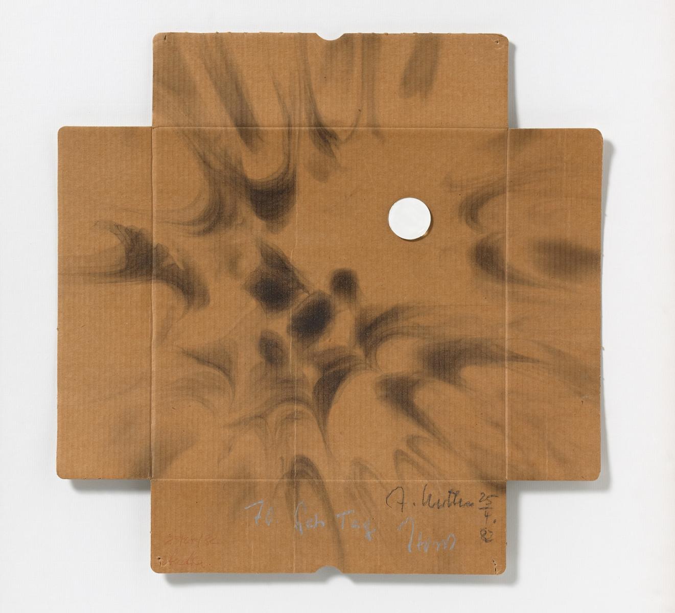 Einladungskarte (Anlässlich des 70. Geburtstags). 1982. Collage (runder Spiegel, Ruß) auf Karton, an vier Seiten gefalzt. 37 x 37cm. Signiert und datiert unten rechts: A. Luther 25/4.82. Darunter bezeichnet: 70. Geb Tag Horst. Z.T. unleserlich bezeichnet in der unteren linken Ecke: 25/4/82 ...(?). Verso montiert. Im Rahmen beschrieben.