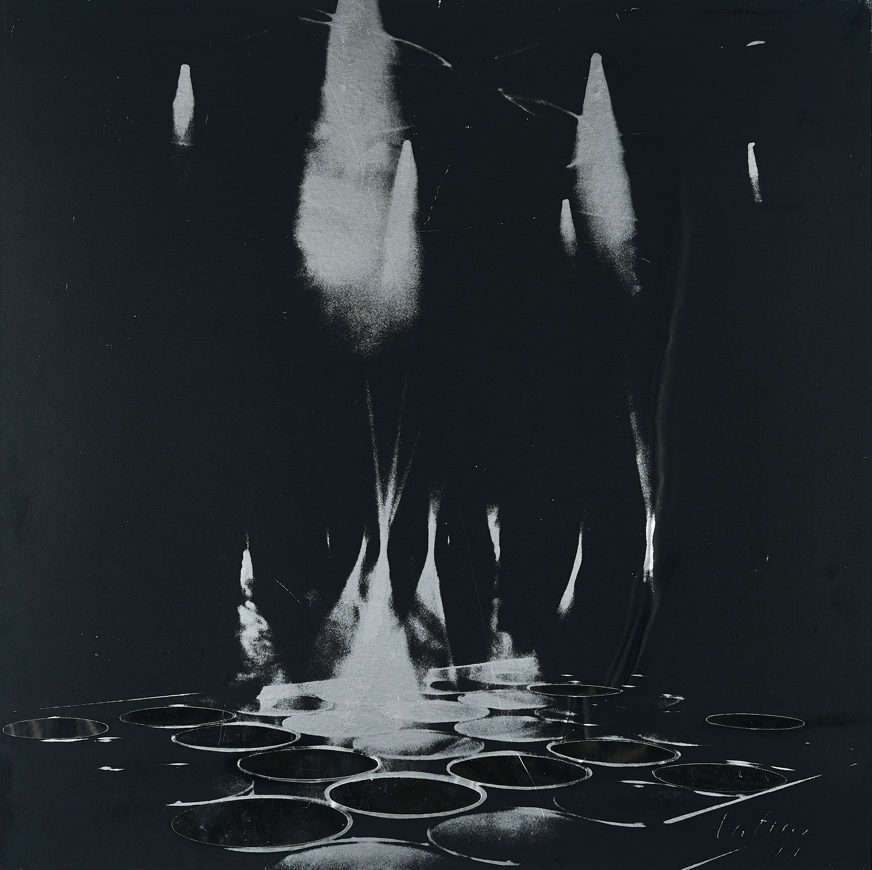 und Folie, collagiert auf leichtem Karton. 48 x 48,5cm. Signiert und datiert.