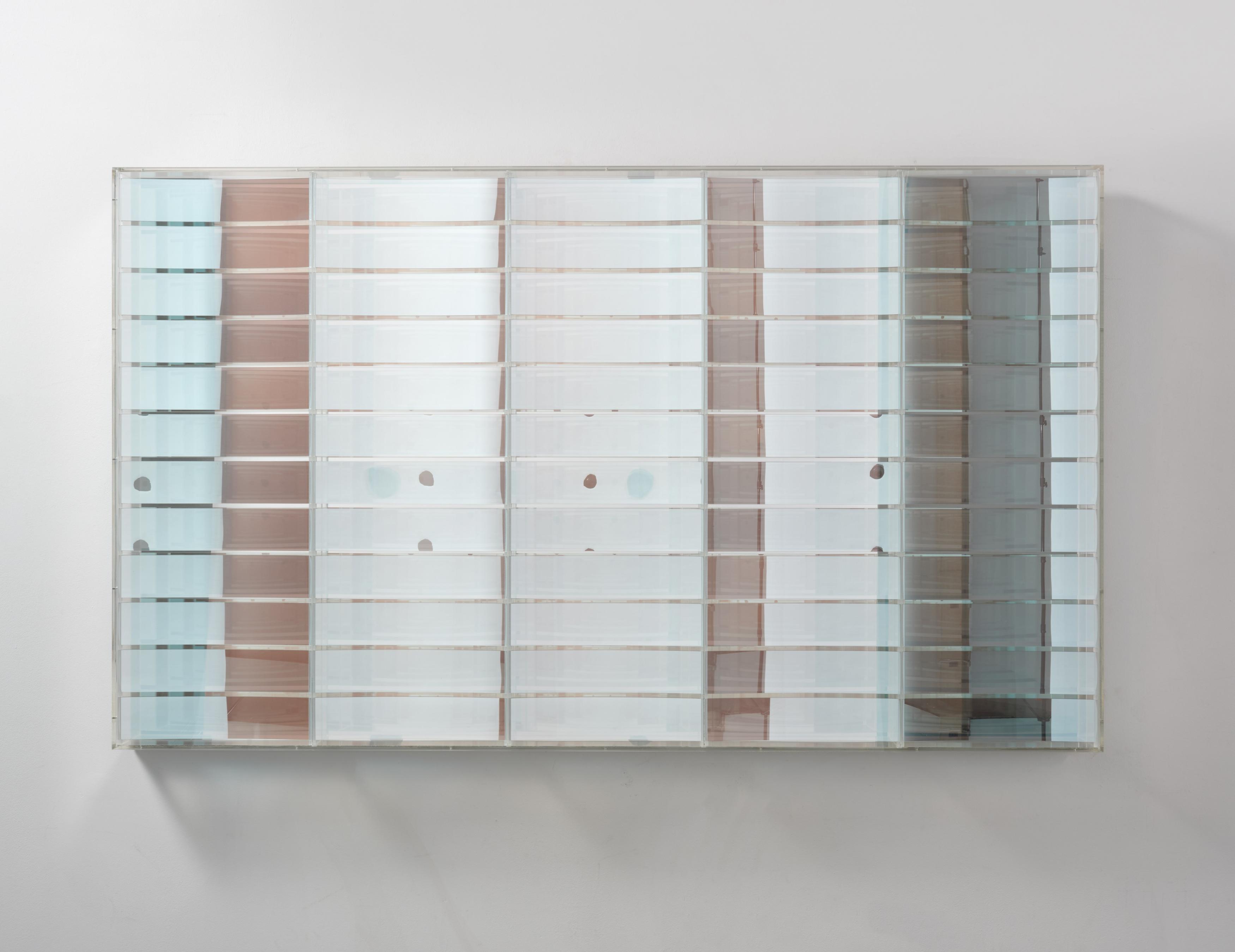 Technik: 60 konkave, halbtransparente Spiegelstreifen vor Spiegelwand, auf Holz montiert. In Plexiglaskastenrahmen.