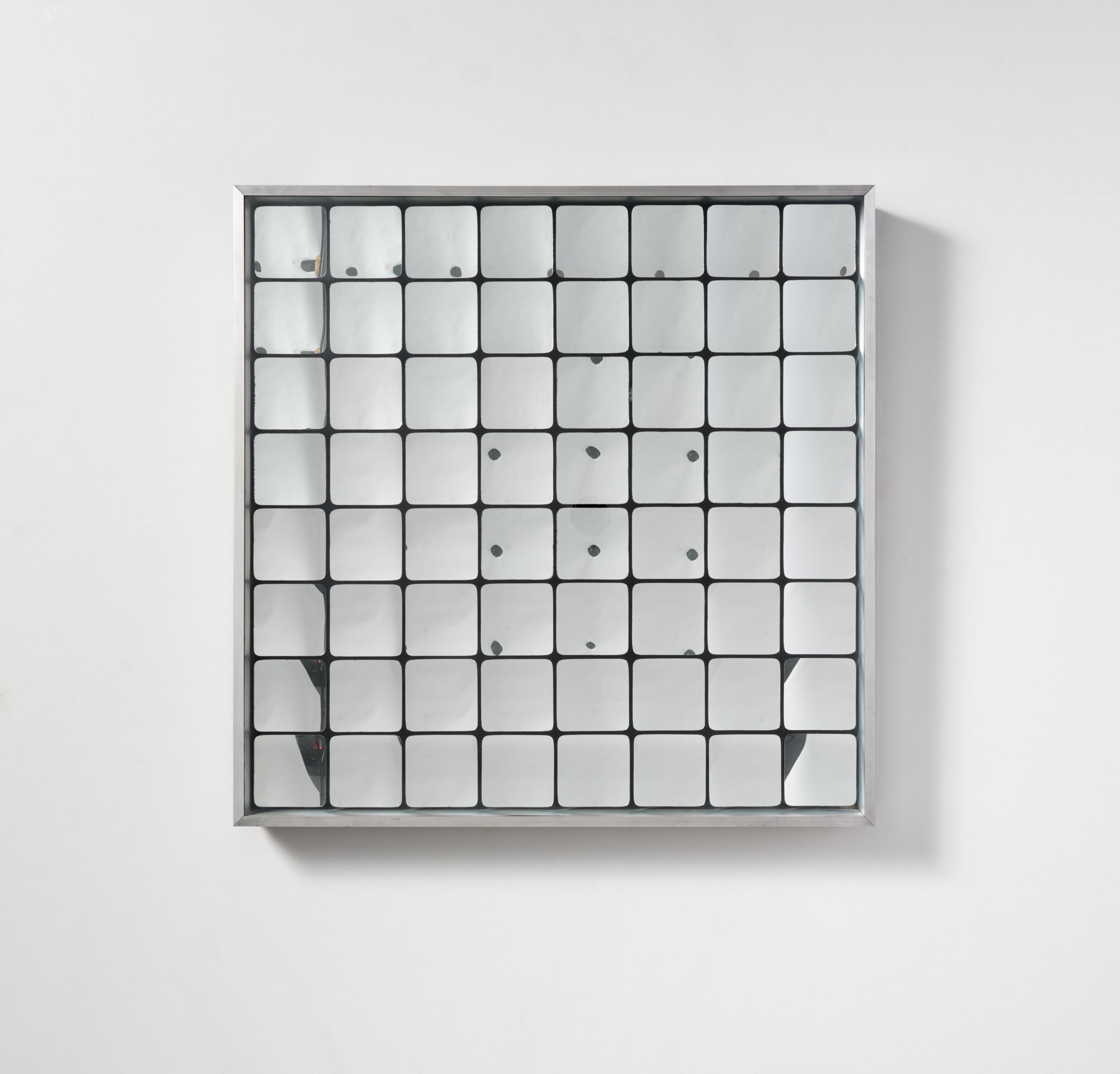 Technik: 64 konkave, quadratische Spiegel mit abgerundeten Ecken, auf Holz montiert. In Objektkasten mit Aluminiumleiste.