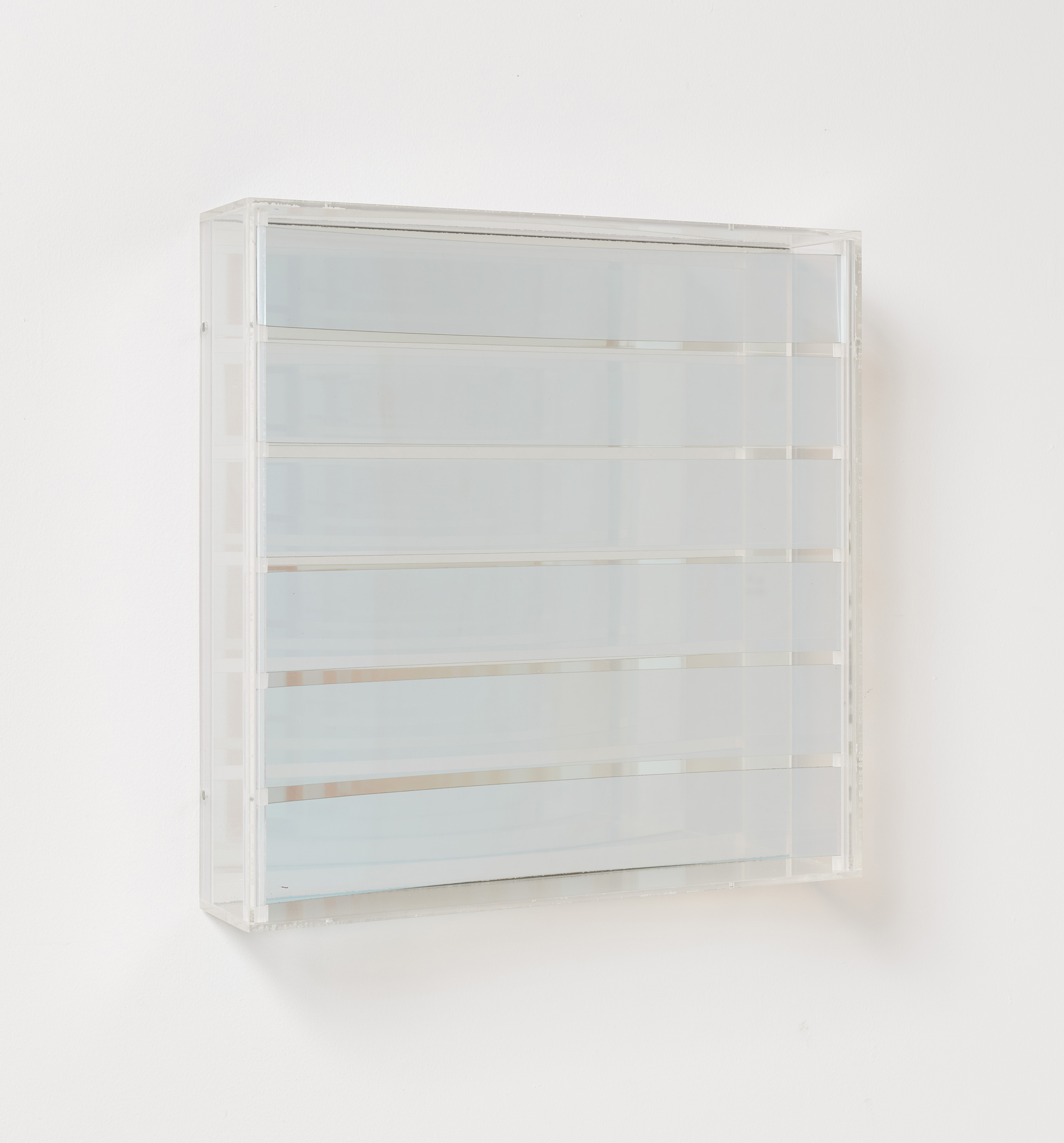 Technik: 6 semitransparente konkave Spiegelstreifen vor Spiegel. In Plexiglaskasten.