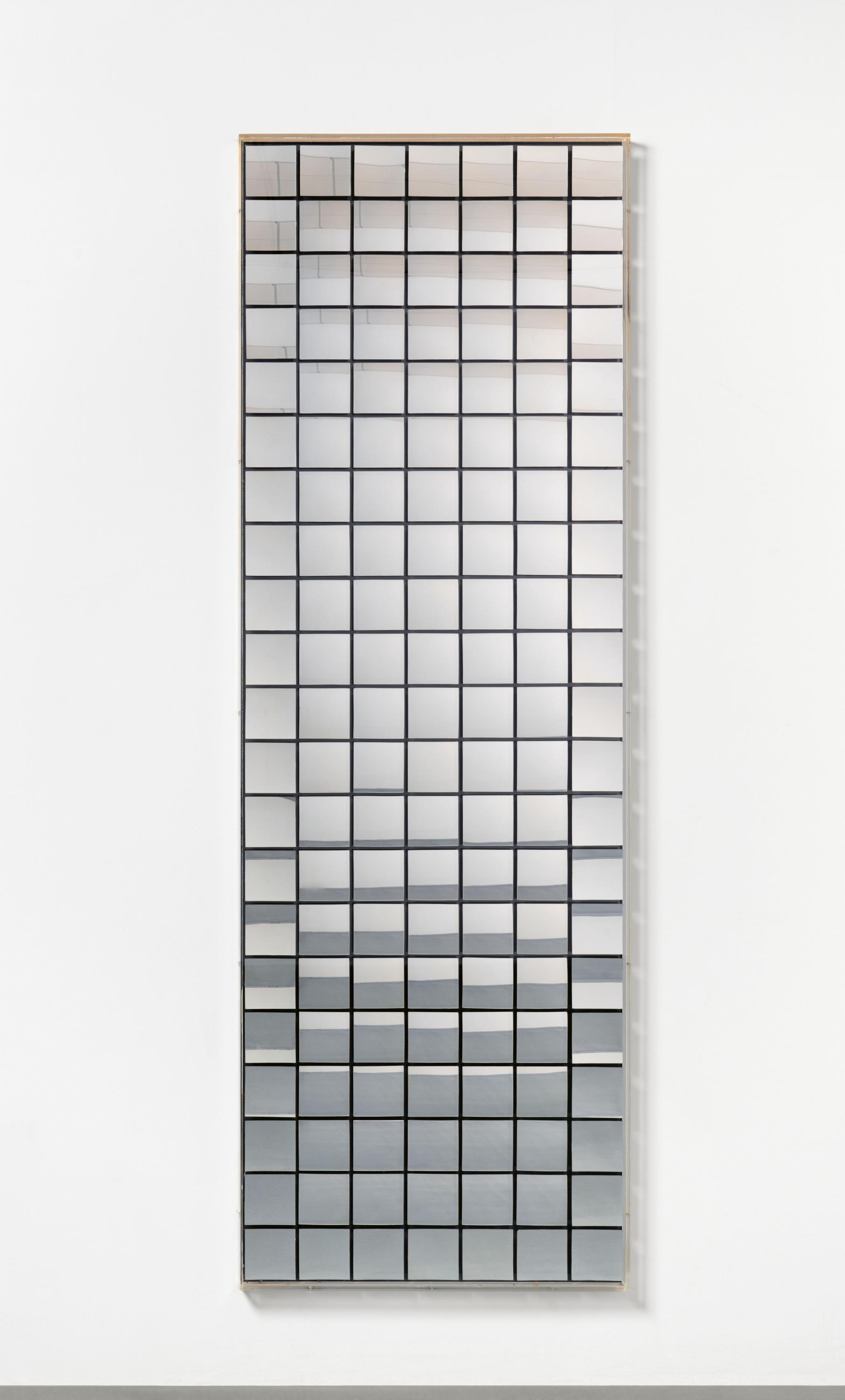 Technik: 140 quadratische Spiegel, konkav und konvex gewölbt, auf schwarz gefasster Holzrückwand. In Plexiglaskasten.
