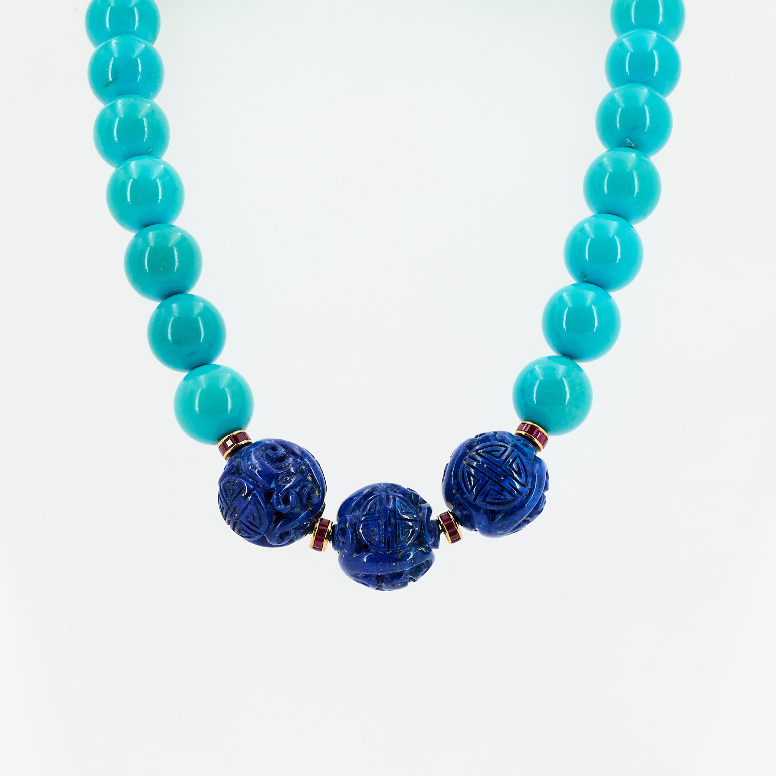 Edelsteine: 23 Türkis-Kugeln Ø ca. 1,5 cm, türkis bis z. T. grünlich, 3 in chinesischem Stil geschnitzte Lapislazuli-Kugeln Ø ca. 1,9 cm, ca. 32 rote Farbsteine im Carré-Schliff, wohl Rubin ca. 2,3 x 2,1 mm.