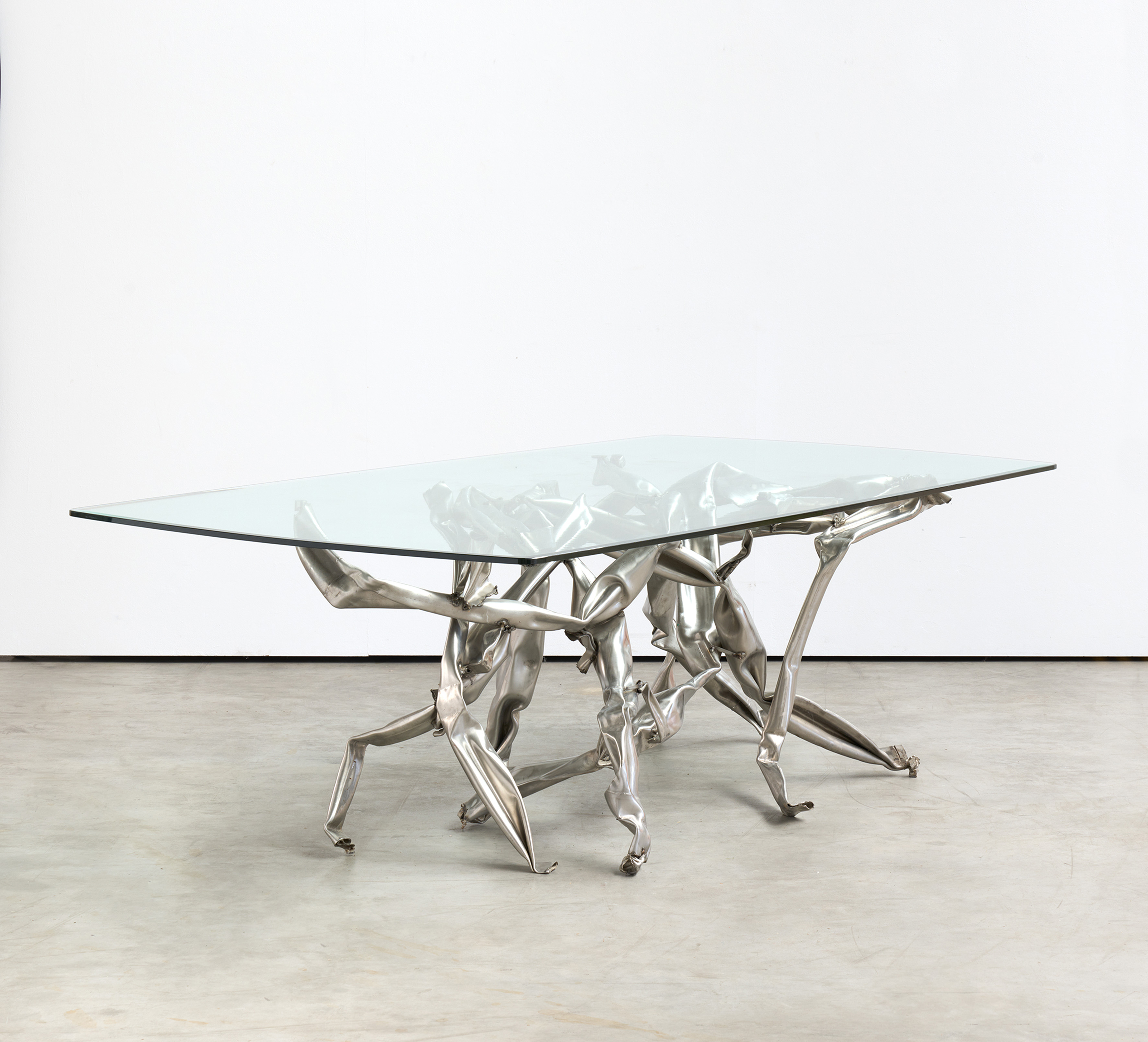 Technik: Tischgestell aus Stahl, Platte aus Glas.