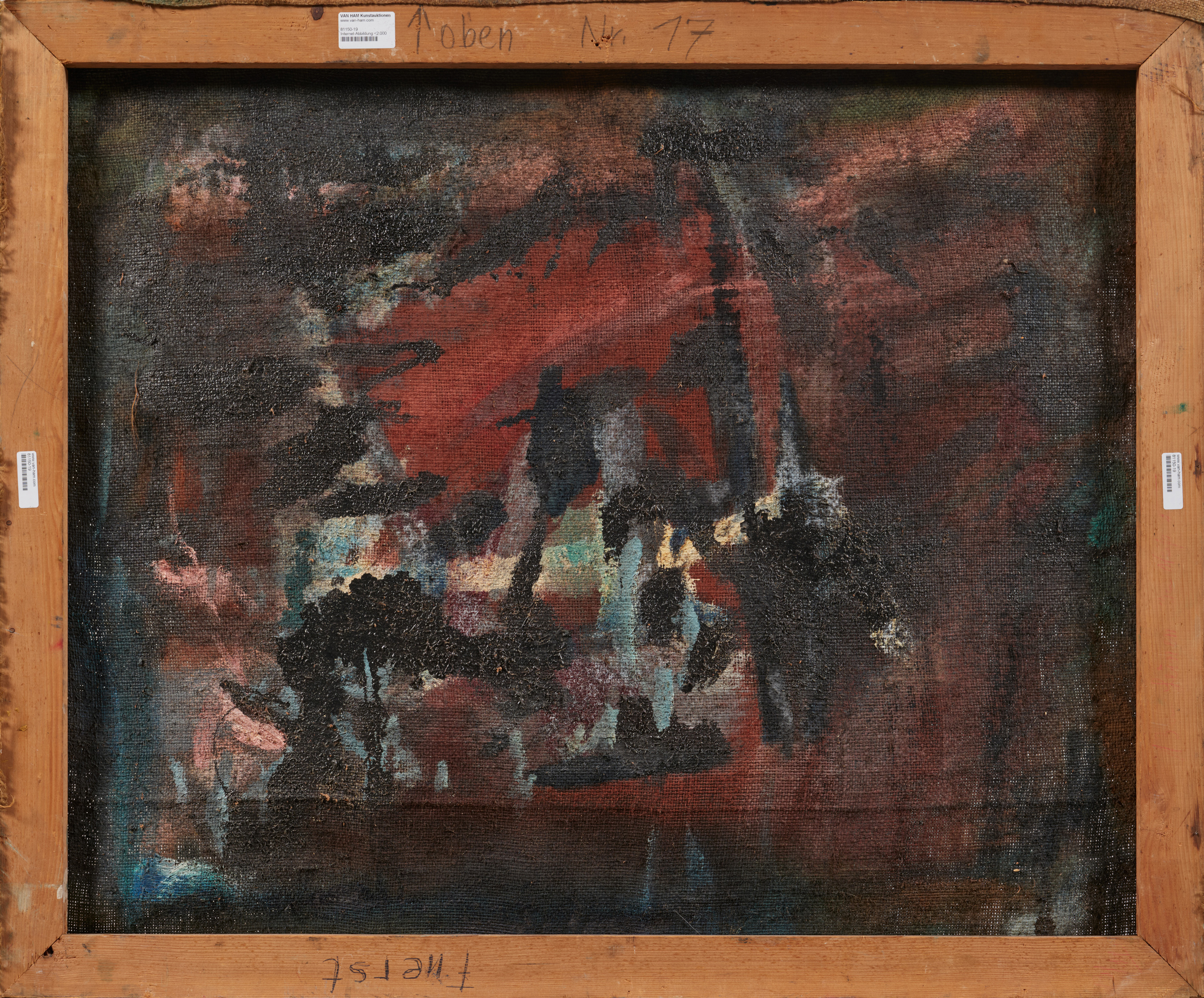 Sehr geringe Leinwandspannung. Jute fusselt leicht. Minimal verschmutzte Malfläche. Ansonsten guter Zustand.