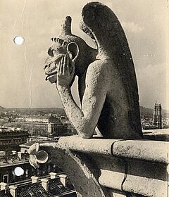 "Les Chimères de Notre-Dame (Le Penseur)". Paris 1950er Jahre. Gelatinesilberabzug. Unterhalb des Bildes Prägung mit dem Namen des Photographen und von Weegee mit blauer
