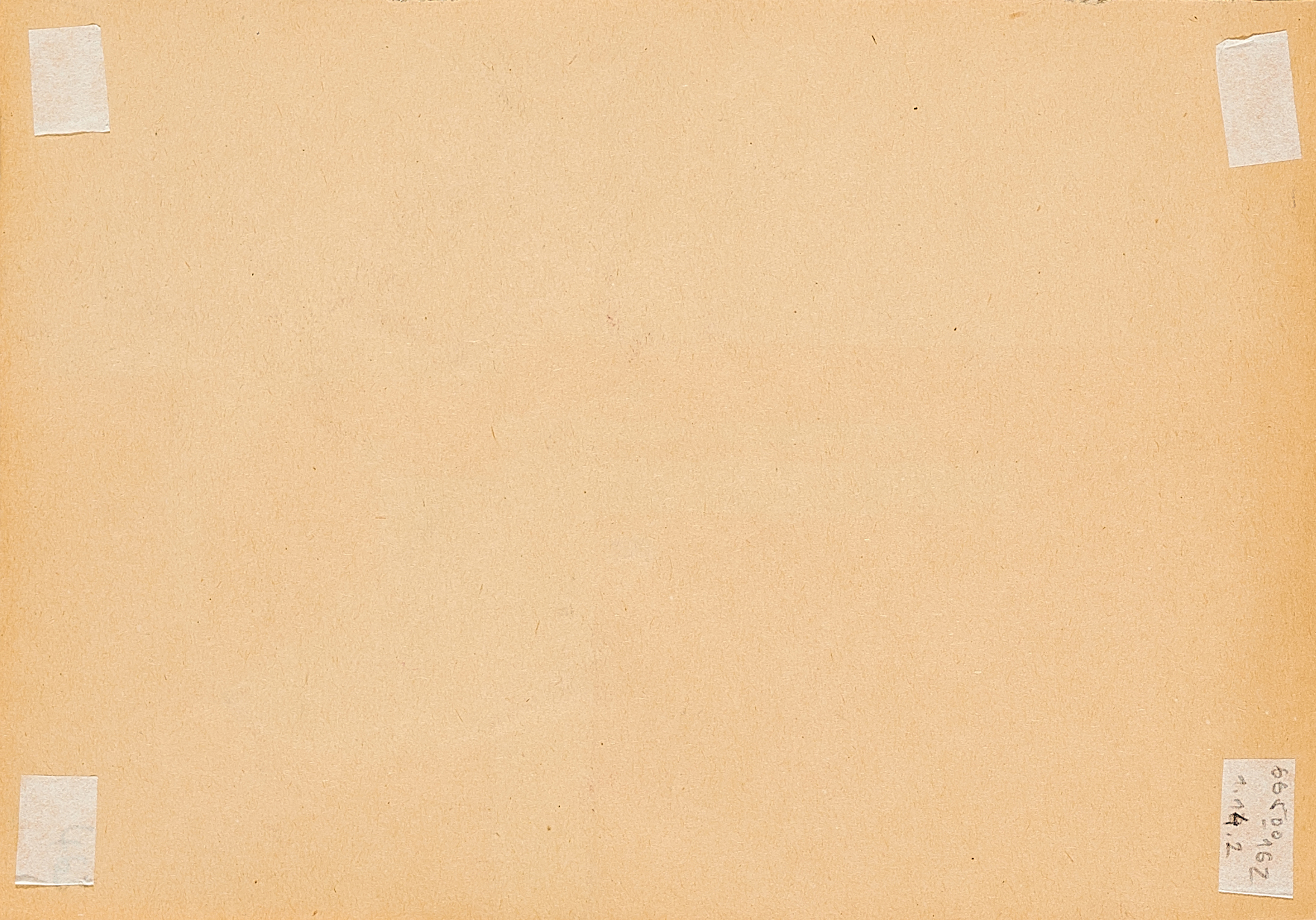 Leichte horizontale Falzspur entlang der oberen Kante links. Vereinzelte Bereibungen. Minimal abgelöster Karton von Collage im unteren Bereich. Verso Reste alter Papiermontierung.