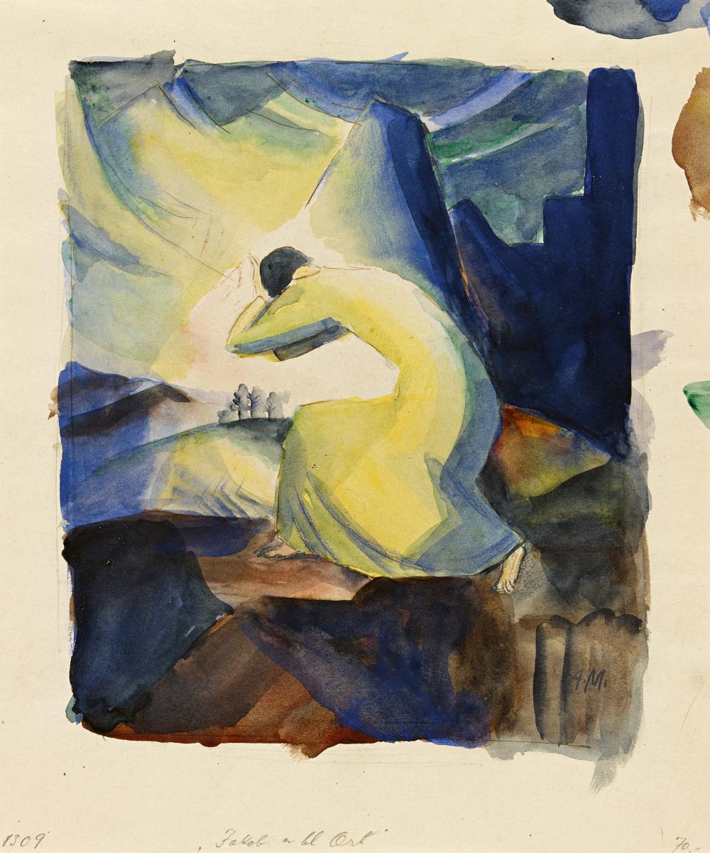 Bezeichnung: Monogrammiert in der Darstellung unten rechts: A.M. Betitelt unten Mitte: Jakob am hl. Ort.