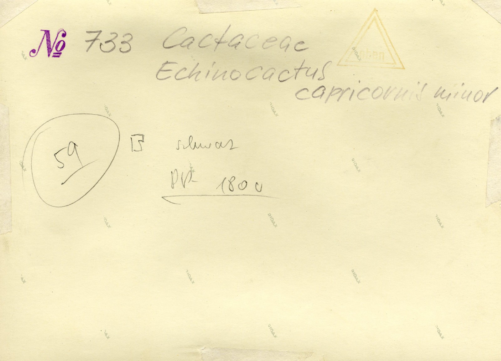"Blühender Kaktus (Cactaceae Echinocactus capricornis minor)". Anfang 1920er Jahre. Gelatinesilberabzug von 1930-1932. Rückseitig gestempelt "No." und "oben". Daneben mit Bleistift nummeriert (733) und