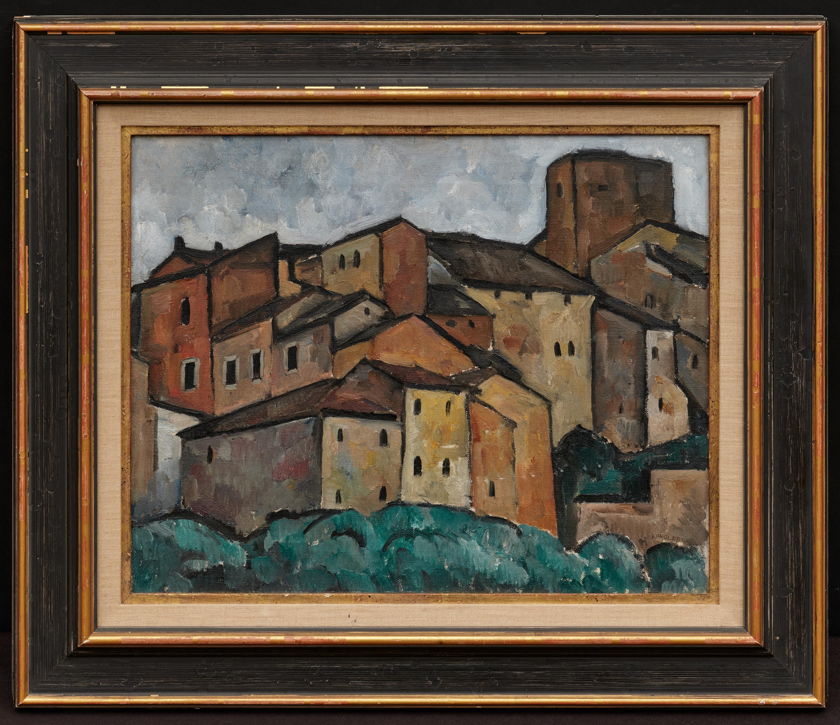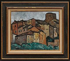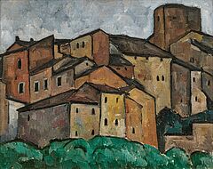 Alexander Kanoldt unternimmt einige Italienreisen, die ihn zu zahlreichen Studien und Skizzen inspirieren. Das angebotene Gemälde entstand kurz vor dem Ersten Weltkrieg und gehört zu Kanoldts frühen Architekturlandschaften. Die kleine toskanische Bergstadt San Gimignano mit ihren kubisch verschachtelten Häusern und den imposanten Geschlechtertürmen regt den Maler immer wieder zu neuen Werken an. Das Gemälde steht einerseits in der Bildtradition romantischer Darstellungen italienischer Bergstädte, anderseits zeugt es durch die Reduzierung auf Flächen und Formen von Kanoldts Auseinandersetzung mit dem Kubismus. Die bewusst zurückgenommene Farbigkeit sowie das Weglassen von schmückenden Details zeigen die zunehmende Tendenz der Versachlichung. Letztere sollte Kanoldts Credo werden und ihn zu einem der wichtigsten Vertreter der Neuen Sachlichkeit werden lassen.