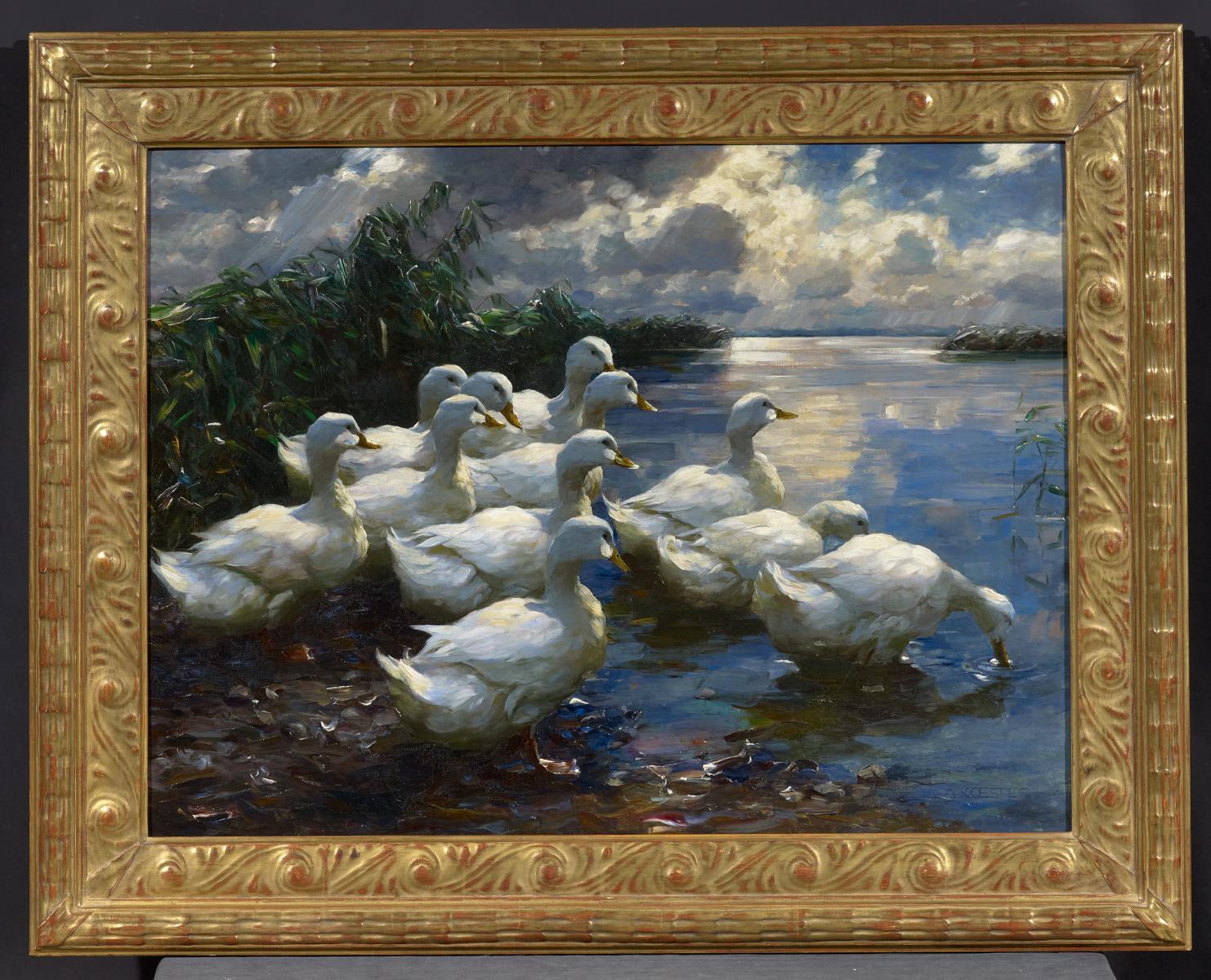 Die vorliegende Arbeit mit den sonnenbeschienenen weißen Enten, den kräftigen Farben des Gewitterhimmels über dem Wasser und dem bewegten Licht-Schatten-Spiel des Schilfgrases dürfte eines der stärksten Gemälde Koesters sein, die in den letzten Jahren angeboten wurde. Eine sehr ähnliche, größere Szenerie zeigt die WVZ-Nr. 804, die zweifellos ein Hauptwerk von Koester ist und als Ausschnitt auf dem Schutzumschlag des WVZ abgebildet ist. Das Licht und die Stimmung bei unserem Gemälde ist allerdings deutlich eindrucksvoller.
