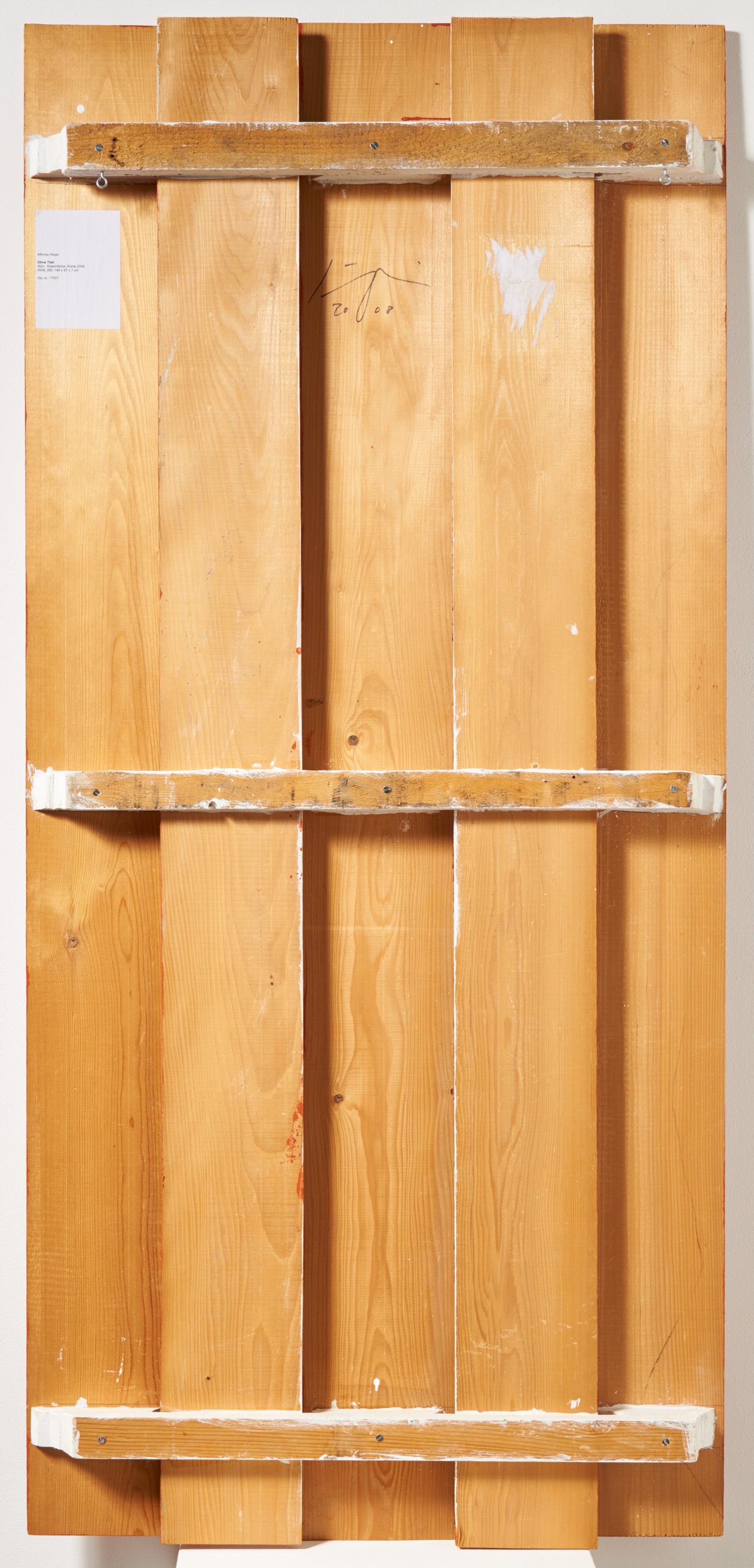 Der Schweizer Künstler und langjähriger Professor an der Düsseldorfer Akademie Alfonso Hüppi lotet in seinen Holzarbeiten immer wieder die Grenzen von Abstraktion und Figuration aus. Drei rote Senkrechten teilen das Relief in Vorder- und Hintergrund. Auf der hinteren Ebene erscheinen im Profil auf weißem Grund zwei sich anschauende Figuren im Profil, links männlich und rechts weiblich. Humorvoll und den erotischen Charakter in der geometrischen Form darstellend, erinnert das Paar in Ihrer Nacktheit und Gegenüberstellung an Sujets von Adam und Eva, während die starke Profilierung einen Bezug in ägyptische Darstellungen von Gottheiten findet. Das dynamische Zwischenspiel im starren Holzrelief von Abstraktion und Figuration, Weiblichkeit und Männlichkeit sowie Trennung und Sichtbarkeit werden in dieser Arbeit vereint.