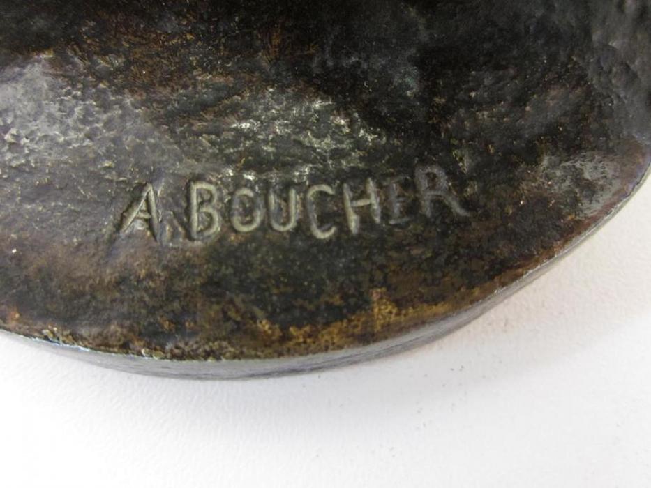 Junge Schnitterin. Bronze. Bezeichnet auf der Plinthe: A. Boucher. Giessereistempel und Nummerierung auf der Plinthe: Siot Decauville, Paris / L 321. Höhe: 29,5cm.