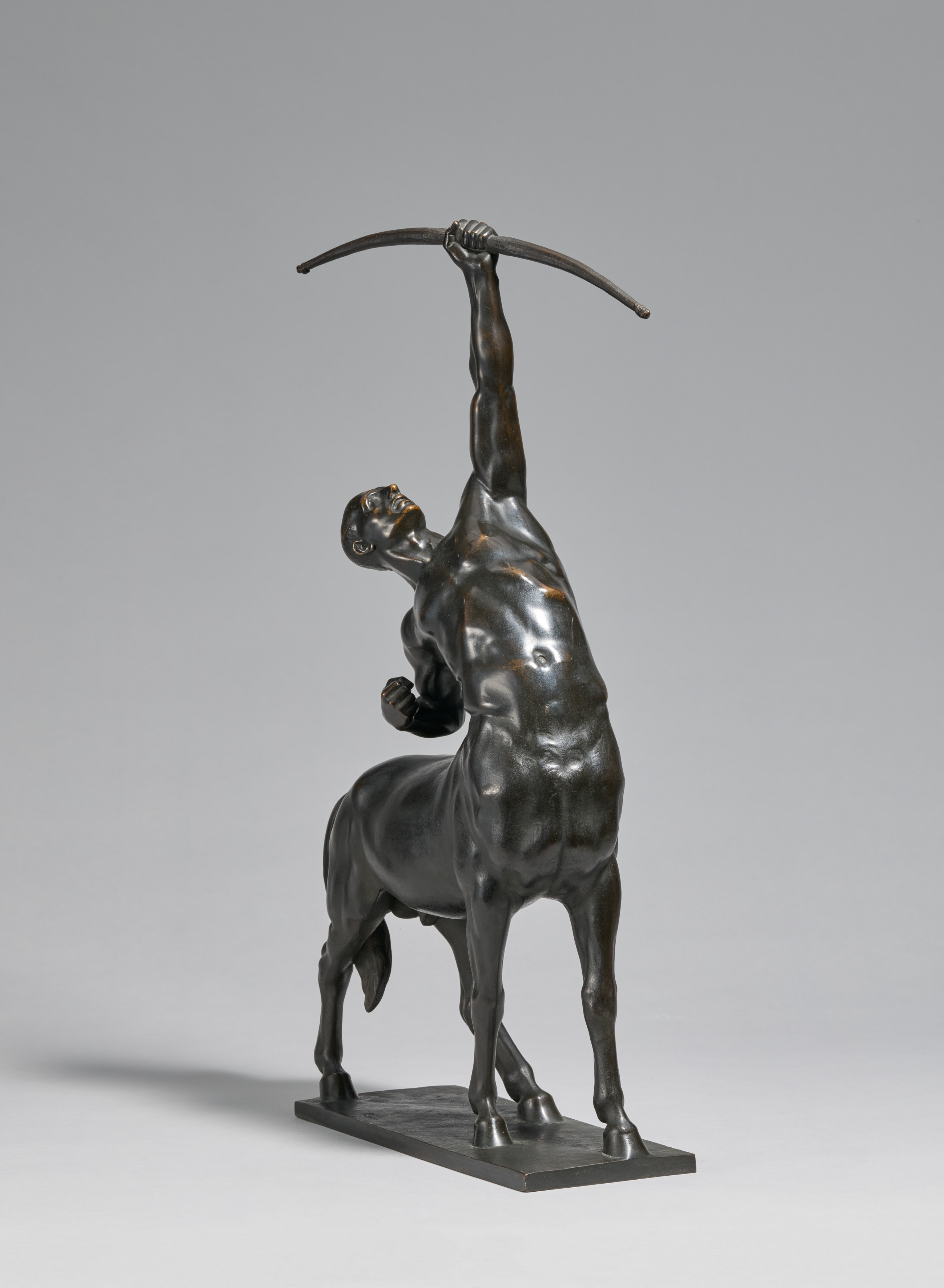 Der deutsche Bildhauer Paul Alfred Raum ist speziell für seine antikisierenden Kleinplastiken bekannt. Der Künstler studierte an der Königlichen Akademie der Künste Berlins zu den Zeiten der Jahrhundertwende. Seine auffällige Begabung verschaffte ihm im Frühjahr 1902 den Großen Staatspreis der Akademie und ein Stipendium, dass ihm einen einjährigen Aufenthalt in der Kunstmetropole Rom ermöglichte. Hier studierte Raum die antiken Skulpturen in Original. Der Romaufenthalt und das Studium der klassisch-antiken Skulptur übten einen wahrhaftig nachhaltigen Einfluss auf seine gesamte Produktion aus. In diesen Kanon der Antikenrezeption gehört auch die vorliegende Skulptur "Kentaur". Sie besticht durch die kontrastreiche Kreuzung einer Horizontalen und Vertikalen in ihrer Komposition. Ergebnis dieser geschickten asymmetrischen Anordnung ist eine regelrecht wuchtige Dynamik, die von athletischer Eleganz begleitet wird. Raum zeigt uns einen Kentauren, der soeben seinen Pfeil auf etwas uns Unbekanntes abfeuerte.