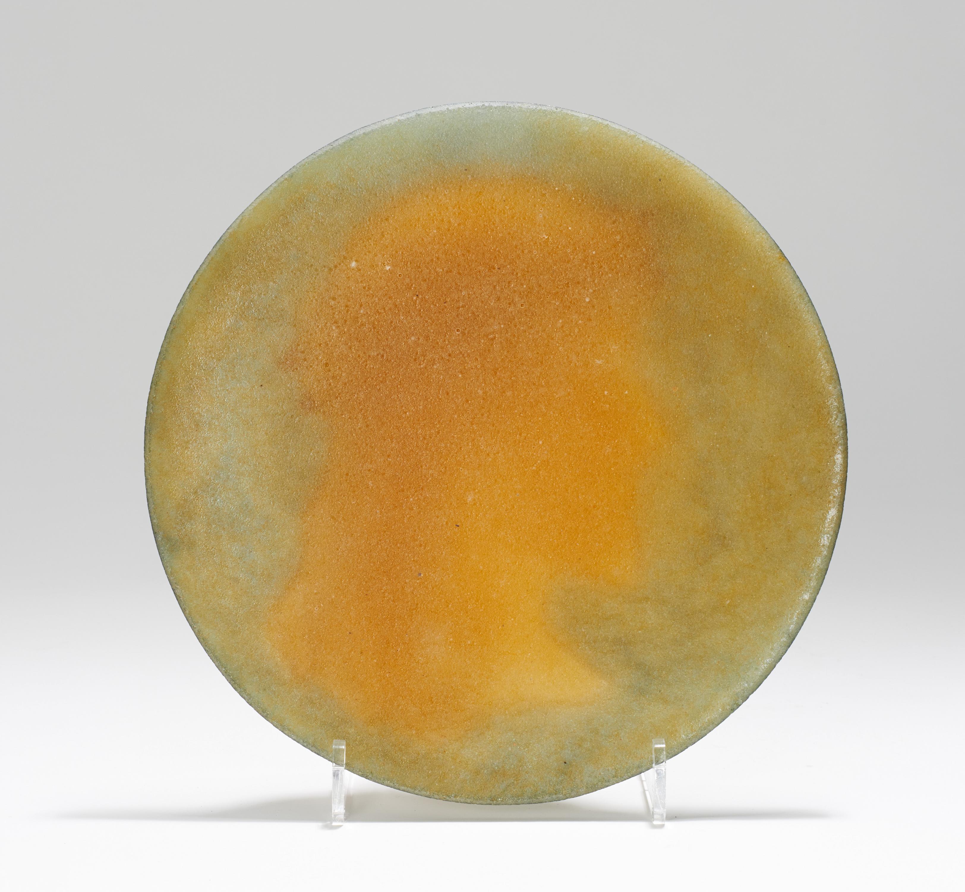 Material: Pâte de verre, transluzide Glasmasse mit vorwiegend hellgrünlich, braunen und bernsteinfarbenen Ein- bzw. Aufschmelzungen.