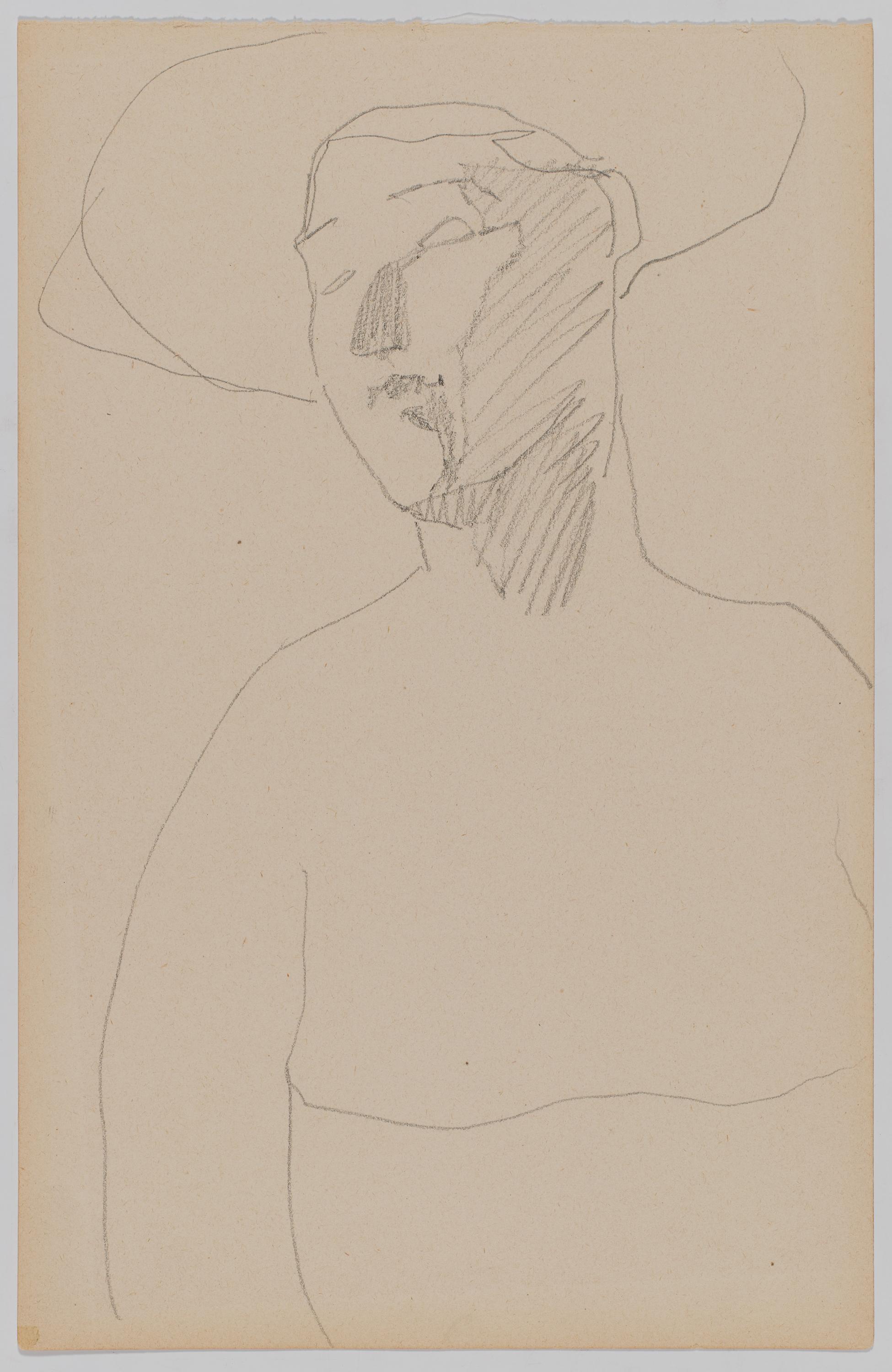 Die im Ausstellungskatalog "Der unbekannte Modigliani" abgebildete zweite Hälfte des Blattes, auf der sich der obere Rand des Huts befand, ist hier fehlend.