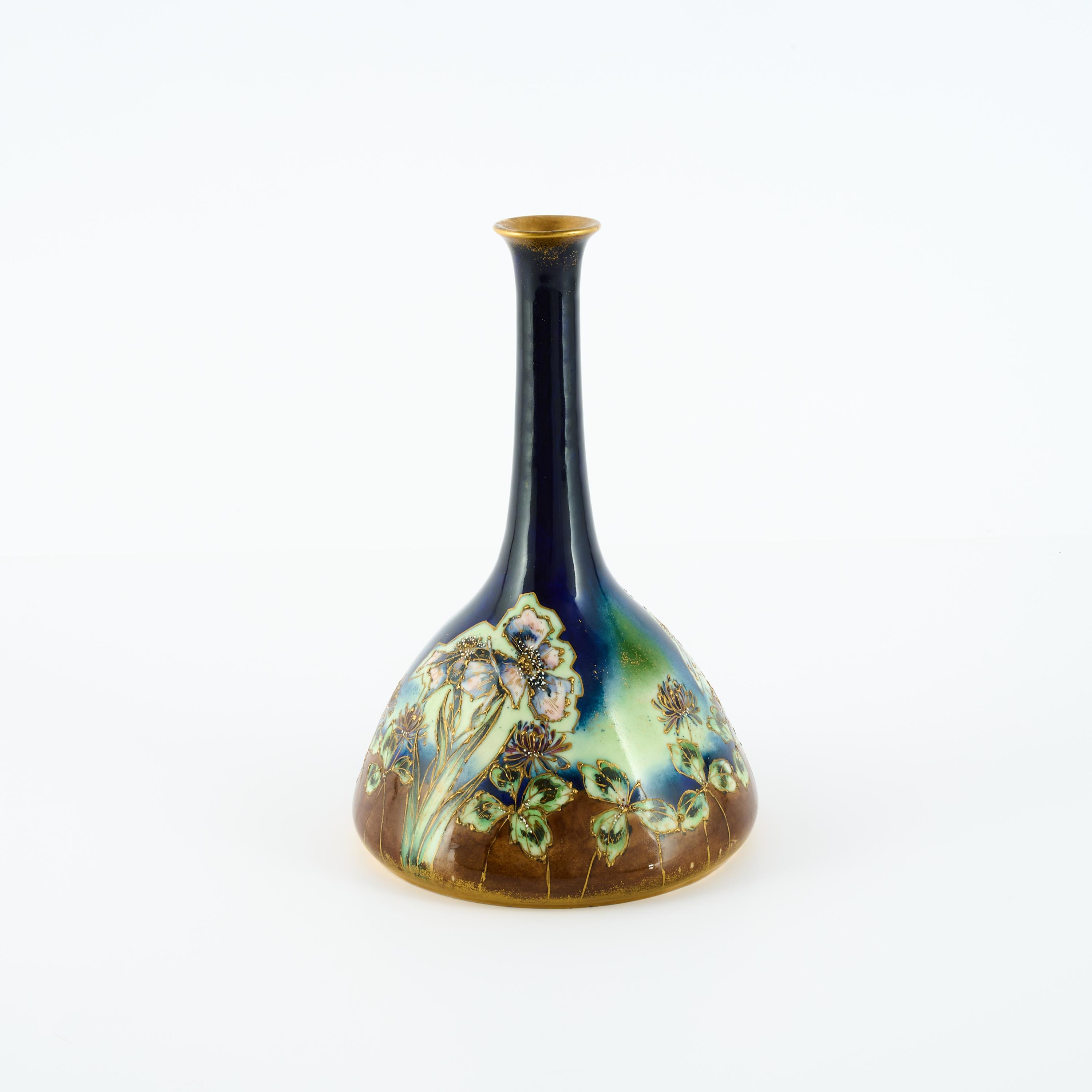 Beschreibung: Konischer Korpus mit langgezogenem Enghals. Wandung umlaufend dekoriert mit Blumen und