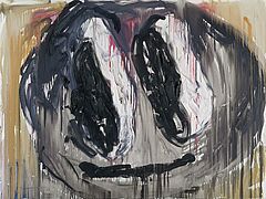 Das zweite hier präsentierte Werk von André Butzer besticht durch eine reduzierte Farbpalette. Über teilweise dünn-lasierende Farben und über Farbläufe setzt der Künstler pastose Farbstriche aus Schwarz und Weiß, die ein rundes Gesicht mit den für Butzer charakteristischen Kulleraugen formen. Akzente werden durch ein helles Rot gesetzt. Durch die comichafte Stilisierung fehlt dem Antlitz jegliche Identität und dennoch kommt es einem Porträt gleich. Somit greift der Künstler wie schon in "Bobby Bohnen und seine Hunde" (Los 362) ein traditionelles kunsthistorisches Sujet auf, dem er eine humorvolle und zeitgenössische Note verleiht.