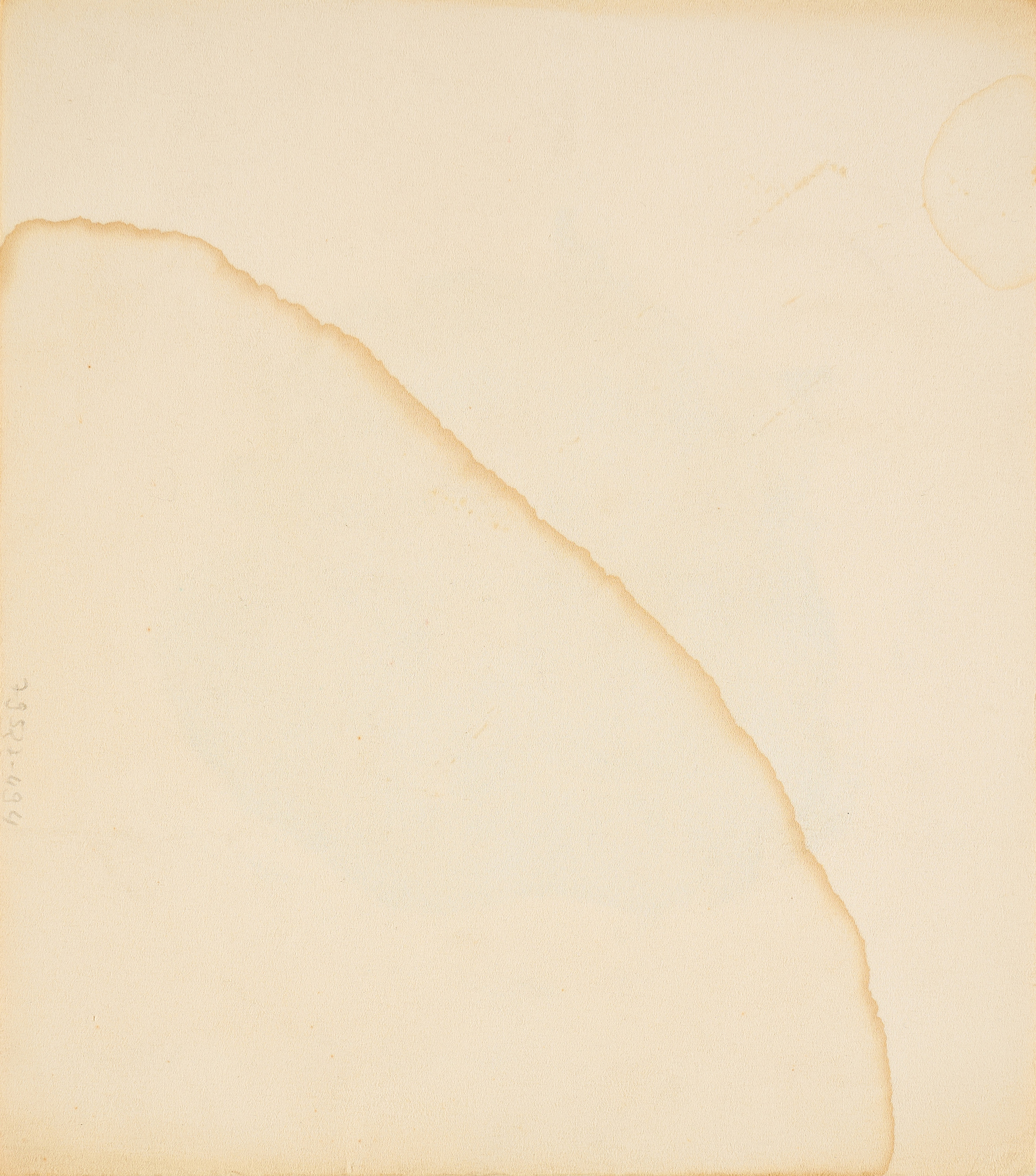 Wasserfleck entlang der Bilddiagonale sowie in der linken oberen Ecke (ca. 4 x 2,5cm). Leichte Verfärbungen entlang der Kanten sowie leichte Bestoßungen entlang der unteren Kante.